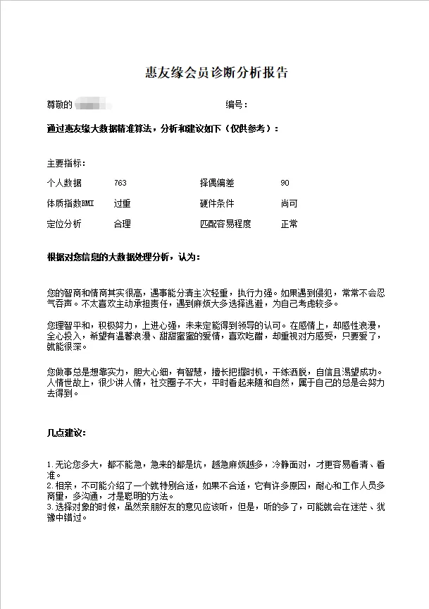科学分析:根据填写的个人基础信息、情感经历和择偶标准,我们的系统会根据多维度的适配指标,生成一份匹配分值和详细分析,就像一份婚恋体检报告,清晰地告诉大家,自己的优势在哪里,适合什么样的人,哪些地方可以慢慢调整。