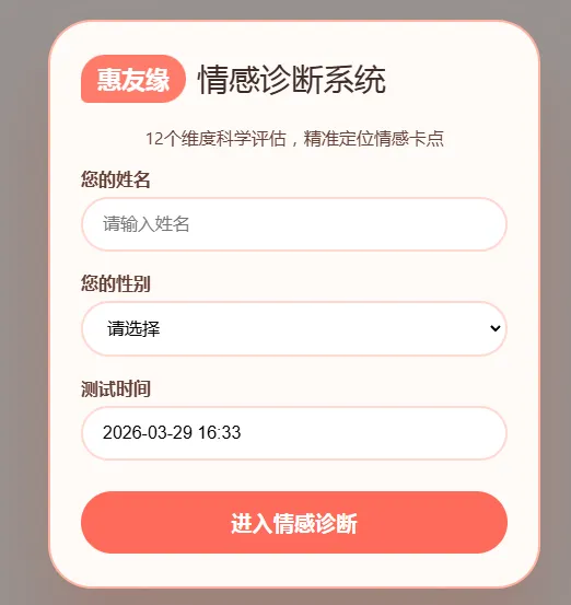 情感诊断:结合面谈的情况,通过自主开发的情感诊断系统,我们会一起拆解那些无形的情感误区——或许是择偶标准太理想化,脱离了现实;或许是沟通方式不够恰当,错过了对的人;又或许是原生家庭的影响,让自己在亲密关系里总是小心翼翼。