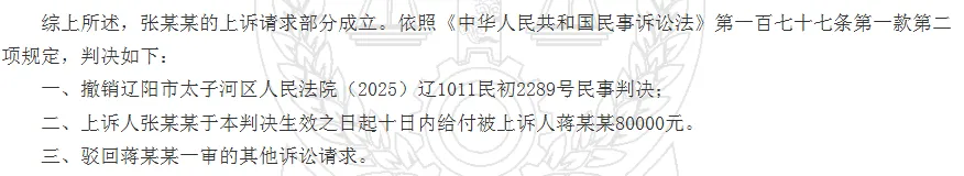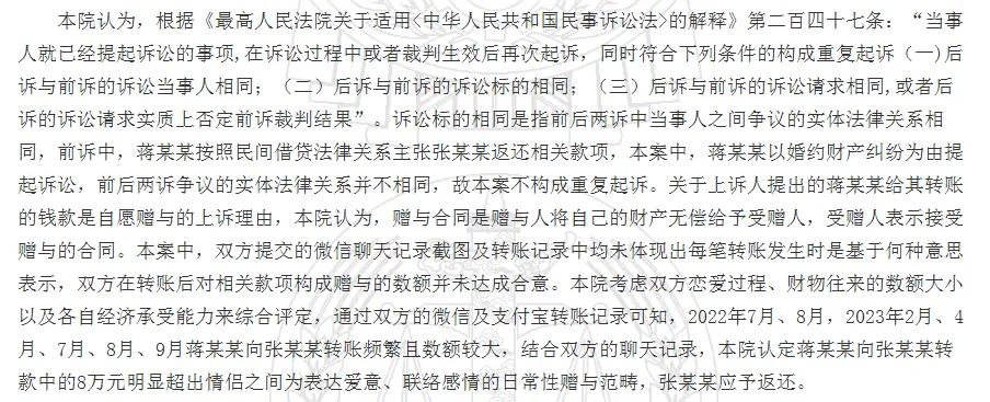 法院最终认定:蒋某某向张某某转款中的8万元,明显超出情侣之间为表达爱意、联络感情的日常性赠与范畴,张某某应予返还。其余部分,属于日常赠与,无需返还。