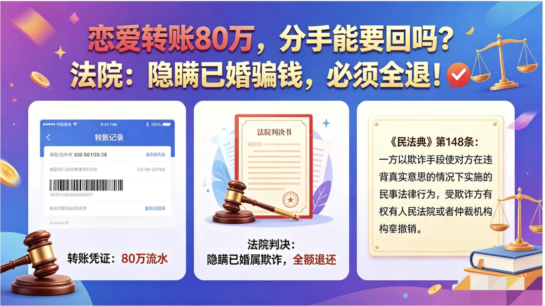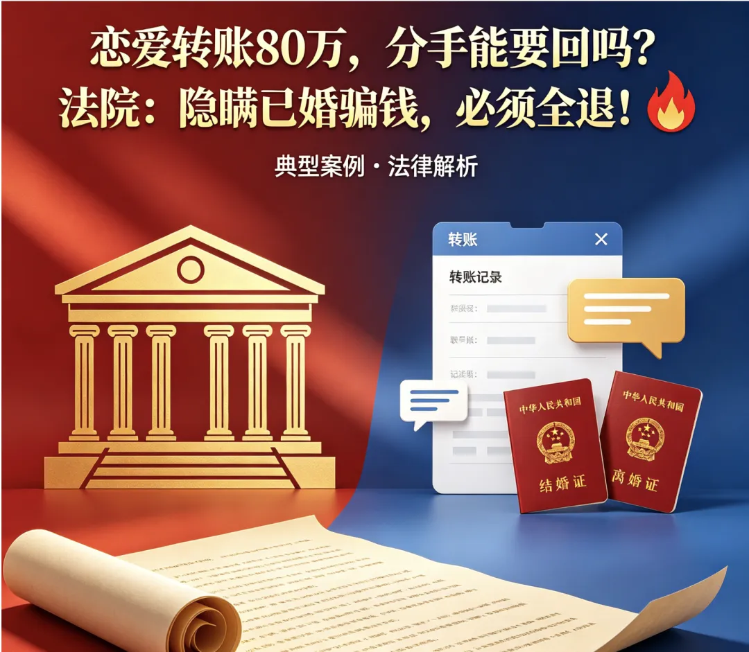 恋爱五年,转账 80 万,对方竟是已婚男!当 "真爱" 遇上精心策划的欺骗,这笔钱还能要回来吗?最高人民法院刚公布的典型案例给出明确答案:隐瞒婚史骗感情又骗钱,法院判决全额返还!这份判决,给所有恋爱中的人上了一堂硬核法律课。