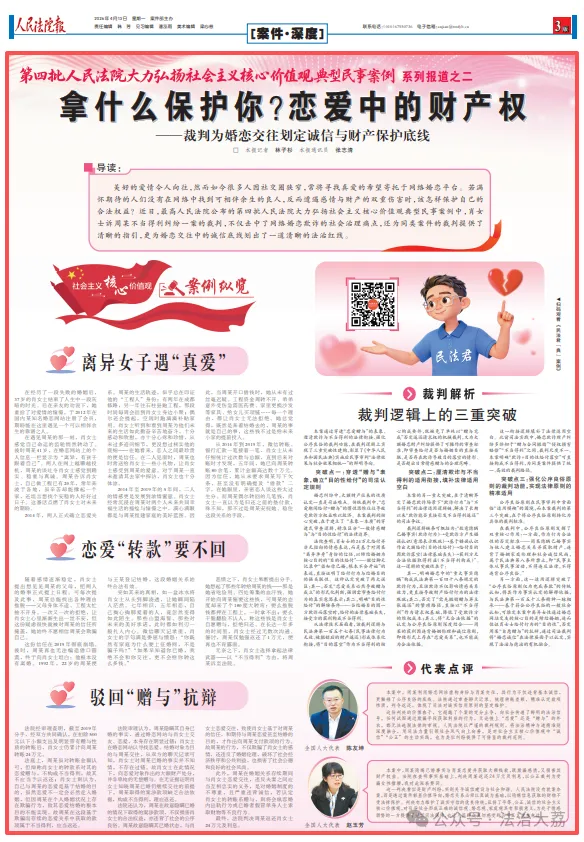 这一判决看似是财产纠纷,实则关乎诚信建设与社会和谐。人民法院没有就案办案,而是透过案件彰显价值导向,婚恋关系必须以真诚为基础,以隐瞒信息获取的财物不受法律保护。判决有力维护了诚实守信的优良传统,弘扬了平等、公正、诚信的社会主义核心价值观,对引导社会形成正确的诚信观、婚恋观、家庭观具有积极意义,为处于情感弱势的一方提供了坚实司法保障,也让人民群众真切感受到公平正义就在身边。