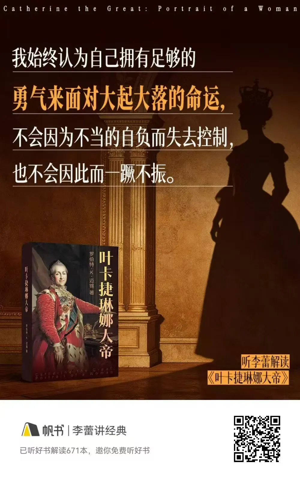 男友们,团长们,大家好,我是树洞清仓平台创始人男姐。想和大家掏心窝子说点心里话,平时我还真不这么苦口婆心劝人。大家都知道,我小时候家境并不好,可以说比大部分团长的成长环境都差:在这里我要郑重的感谢我的两个孩子,是孩子的出生,又让我爱上了读书,从孕育第一个孩子开始,我就买了各种怀孕和分娩,哺育的书籍,真是开启了人生第二个“读书积极时期”,小时候读书不知道为什么而读,而有了孩子以后读书,是为了孩子,也成就了自己。所以,与我而言,孩子不是累赘,而是帮助我进步的阶梯,督促我上进的内驱力。以前我喜欢和医学,工作相关的内容,后来随着其总开始听世界名著和国内的经典,弥补了自己童年读书的缺陷。我小的时候,父母不知道给买课外书,流传的课外书又都是武侠和琼瑶,所以世界名著和经典其实反而读的少。在看过的那些情情爱爱的书籍影响下,我也做过恋爱脑,第一场恋爱谈的自己血肉模糊欲罢不能,还好及时了断离开了家乡来到珠海重新开始,不然真是沉沦在情爱的泥沼里找不到自我。后来才发现,女性必须要活成一束光,一把锤子,一颗炸弹,而不是一颗花草一只鸟雀。我生了两个女儿,如何让她们不要恋爱脑,养育老大的时候没概念,也没有很多App帮助我们塑造她们的三观。但是养老二时,各种APP层出不穷,只要引导对了方向,你会发现孩子完全可以按照想要的方向思考。而三观的塑造,我借助了《帆书》也就是以前的樊登读书,每天晚上9:00上床,我们一起聊天,然后共同选一本书来听着助眠。这几年不知不觉,孩子已经听完了大部分的世界名著和经典。我会有意识的给她听一些优秀女性的传记,让她知道女人应该是怎样的。听我的偶像林徽因,让她看到一位女子兼具才情与理想,深耕建筑事业,为梦想奔赴的执着;听金斯伯格大法官,看她用一生为女性权益、为公平正义抗争,活成独立且有力量的榜样;听居里夫人,感受她在科学领域潜心钻研,用智慧与坚持改写世界的执着;听万婴之母林巧稚,读懂她一生医者仁心,心怀大爱、坚守使命的伟大;听上官婉儿,见识她凭借才情与智慧,在历史舞台上绽放女官的光芒。这些故事里,没有狗血的绯闻轶事,没有纠缠不休的情爱纠葛,更没有依附男人、摇尾乞怜的卑微,只有一个个真实、鲜活、独立、有理想、有担当、有格局的女性。也有男友说,自己家养儿子,能不能给儿子们列个书单?李蕾讲经典·男性领袖/伟人/枭雄传记中有开国将帅、中外领袖、帝王、政治家、军事强人,全部适合男孩听,主打格局、领导力、意志、担当、历史视野。比如《毛泽东传》让孩子越挫越勇、敢作敢为、大气量、大格局、大担当,懂什么是信仰、使命、为天下人做事。《周恩来:大无大有》教会孩子儒雅、智慧、教养、风度、情商、责任,一生为公、严于律己、做一个让人敬佩的君子强者。这也是我少年时代的偶像,所以给老大起大名时我也用了“恩”字,可见好的偶像对自己的影响。《邓小平:三起三落》教会孩子改革创新,人生低谷不垮、越压越强、宠辱不惊,敢闯敢改、眼光长远、务实才是真智慧。《拿破仑传》 从平民到皇帝让孩子明白出身低微也能靠自己逆袭,要自信、自律、极度渴望成功、敢想敢干,懂得伟大的人生,要敢创造历史。 《凯撒大帝》则告诉孩子 “我来,我见,我征服”,要霸气、决断、做强者的宣言、行动派。 《华盛顿:美国之父》则告诉孩子克制、民主、责任、不贪恋权力,真正的伟大是懂得克制权力。《林肯:解放黑奴》让孩子懂得身为领袖也需要仁慈、坚韧、正义、悲悯、为弱者发声、内心强大。《丘吉尔:永不屈服》则告诉孩子绝境中鼓舞人心、语言就是力量、永不放弃。《刘邦:布衣天子》则在用人、格局、从无赖到皇帝、能屈能伸,懂用人、会团结、能忍常人不能忍,成大事者,不纠结小节、看长远。 《曹操:国之枭雄》绝不仅仅是白脸的奸臣,而是具备谋略、霸气、爱才、诗人的治世之能臣,乱世之奸雄,男人要复杂、立体、有野心也有柔情。《康熙:大帝》则是少年掌权、除鳌拜、平三藩、眼界、隐忍的典范,少年老成、忍、稳、准、眼光长远。还有咱们的各位将军《朱德:元帅之父》《粟裕:一代战神》《彭德怀:横马立刀》《林彪:兵贵神速》《许世友:铁血将军》和西方文学里的男性强者《约翰·克利斯朵夫》《斯巴达克斯》都是男孩子值得听的。当然我们听完女孩的也会听这些,要让女孩子知道什么样的男人才值得托付,而不是遇上一个黄毛就要死要活!听这些不是让孩子当领导,而是养大气量、大格局、大志向!学领导力、决断力、抗压能力!懂责任、使命、血性、担当、永不认输!这次世界读书日会员活动是388元1年,买1年送1年:如买1年樊登读书 送1年樊登读书,买1年李蕾讲经典送1年李蕾讲经典,买1年非凡精读送1年非凡精读。登录帆书APP——点击我的,即可查看到会员到账情况,如果您之前是樊登讲书老会员了,那么会在您原本的会员时间上顺延2年。4月读书月的活动还争取到了确认收货后退28元到树洞储值卡上的活动,相当于立减28元了。所以趁着还在活动期间,可以直接下单这是在别的平台没有的,活动截止到4月29日晚上10点。特别提醒:拍下产品后一定要备注【注册登录帐号+姓名】,就是你用来登录樊登的手机号,千万千万千万要填写正确,因手机号码填写错误造成的损