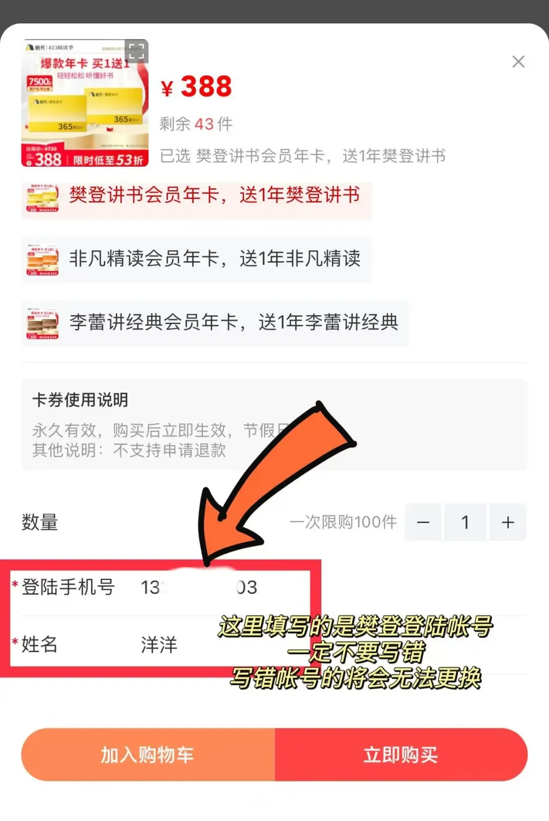 一个栏目一年300多块钱,买一年送一年算起来一百多一年,大人孩子都能听。自己成长的,孩子有关的,包括夫妻关系,创业职场,都有!内容是每周更新,都会紧贴时代,AI的内容最近也有。健康方面的也很多,这是最近我在听的书单,有些我会反复的听。帆书里边有好几个栏目,比如樊登读书里边就全部都是樊登讲书,还有一个李蕾讲经典,这个我们家其总最喜欢听;还有一个非凡精读馆,是跟医学这些方面相关的比较多,我最近也听得比较多。每个栏目都是单独付费的,但是现在都有买一送一,所以很划算。我买的时候,当年还没有买一送一,全部都是原价买的呢。不同栏目有不同的侧重点,大家可以根据自己的需求选择会员。李蕾讲经典,更像是枕边的“心理安抚师”, 娓娓道来的经典著作不会再觉得生硬晦涩, 而是能真切感受到世界的美好。非凡精读,更聚焦于职场和专业领域的阅读,适合职场妈妈,不只是知识的叠加,而是自我提升的“加油站”。我最喜欢的是里边医生的关于健康方面的书籍解读。如果听完了以后觉得还不错,就可以像我一样养成习惯,我是每天晚上睡前都一定会听书的,这么多年下来,基本上感兴趣的书都听的七七八八。只需要这么一点点钱,就能够踩在前人智慧的肩膀上,是非常值得的。很多我们自己想不明白的道理,实际上通过听书就豁然开朗。有一句话说,人生的困境和痛苦其实来源于书读的不够多,并不是指应试教育的书,而是指这些前人的经验。所以,如果试听完了以后,想要购买的可以在树洞购买,价格和官方是一样的,我们是他们的正式代理商。这次樊登会员活动是388元1年,买1年送1年:如买1年樊登读书 送1年樊登读书,买1年李蕾讲经典送1年李蕾讲经典,买1年非凡精读送1年非凡精读。 4月的活动争取到了确认收货后退28元到会员储值卡上的活动,相当于立减28元了。所以趁着还在活动期间,可以直接下单这是在别的平台没有的,活动截止到4月29日晚上10点。特别提醒:拍下产品后一定要备注【注册登录帐号+姓名】,就是你用来登录樊登的手机号,千万千万千万要填写正确,因手机号码填写错误造成的损失,官网是无法售后的。下单之后,工作人员会按照下单顺序开通,期间您无需任何操作,等待即可。开通成功的您登录账号的手机号码会收到1条开通成功的短信,说明您的读书卡已经开通成功了!(收到短信不需要再操作任何东西,直接登录APP查看即可)注意:如果还没有收到开通短信,就是工作人员还未开通,耐心等待即可。产品:樊登读书年度会员卡买一送一,买樊登送樊登,买李蕾送李蕾,买非凡送非凡