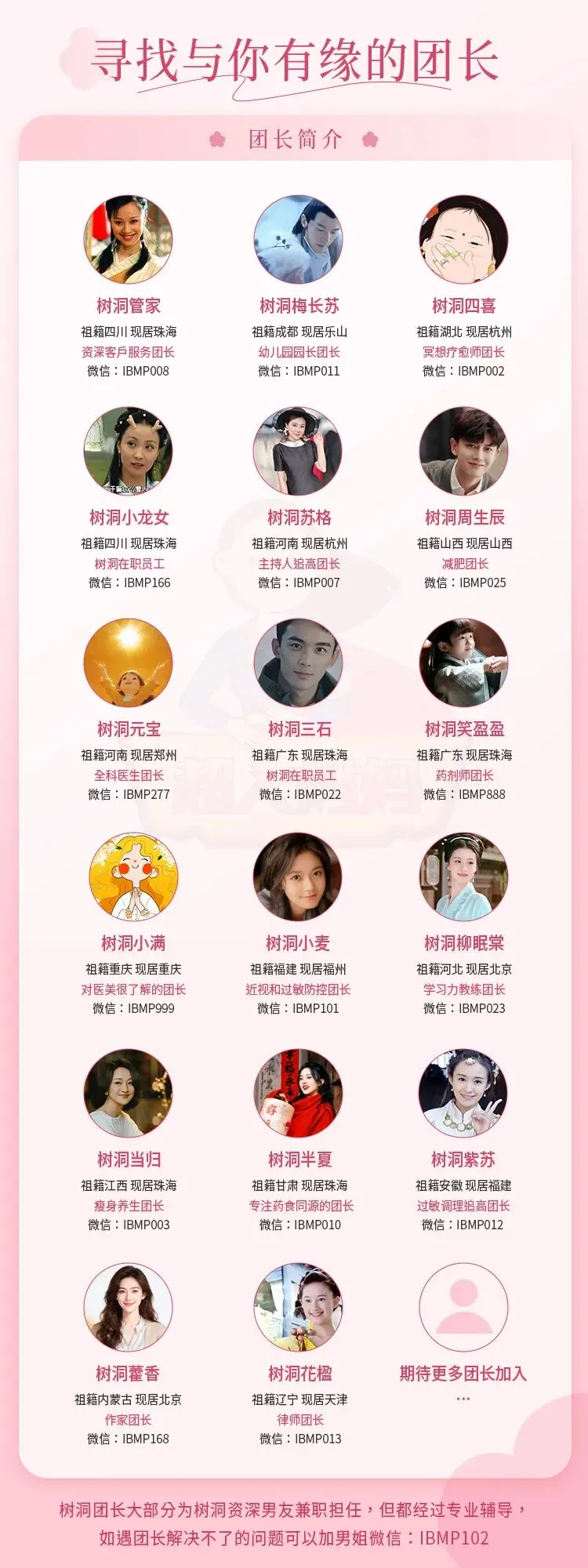 树洞有很多优秀的团长,每个人都各有优势,售前售后问题可以私下联系团长,大家可以根据不同的需求选择。如果你也想应聘团长的话,需要先和老团长建议链接,由老团长向公司推荐,团长的微信在这里可以添加: