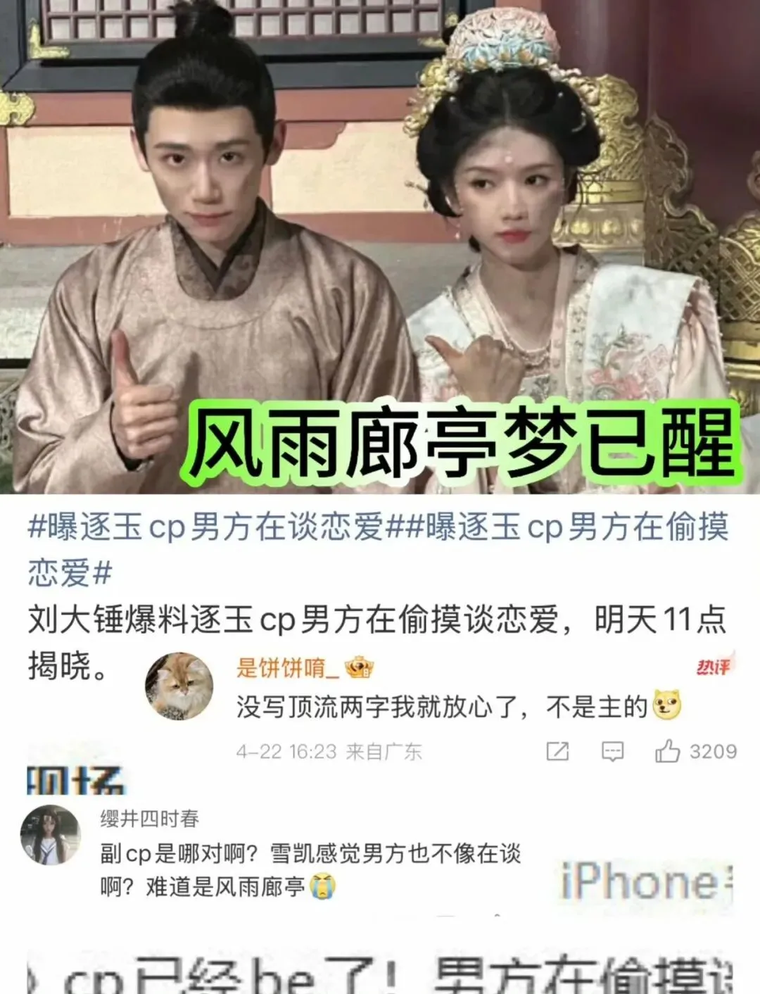 狗仔操作:22日预告《逐玉》某CP因男方“偷摸恋爱”导致关系破裂(BE),引发全网猜测;23日正式锁定李卿为当事人,排除张凌赫、邓凯等艺人。