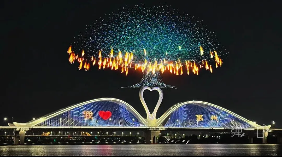 在惠州的东江之上藏着这样一座浪漫的桥。 公司运动群团建,然后刷到同事的照片:原来惠州的浪漫,居然是藏在鹅城大桥的夜色里。 两只天鹅颈相拥,在夜空里拼成一颗完整的心,桥身亮起“我爱惠州”的灯光,温柔得不像话。更绝的是遇上烟花的瞬间,金色的火焰倾泻而下,紧接着漫天星光炸开,像一棵从心尖上长出来的烟火树,把东江的夜,衬得格外璀璨。