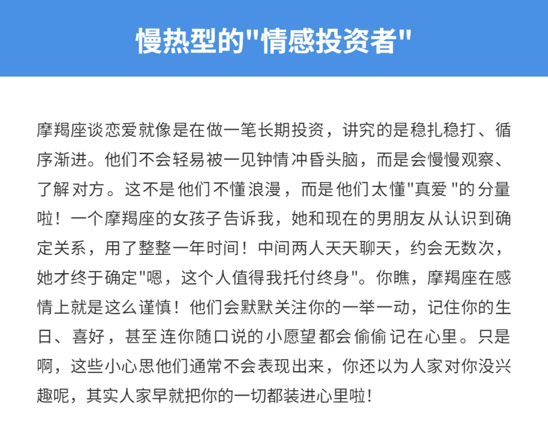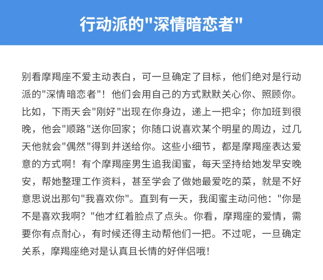 亲爱的星座朋友们,你们有没有遇到过这样的摩羯座:明明对你有好感,眼神都藏不住那份喜欢,却迟迟不肯迈出那一步?没错,在十二星座中,摩羯座可以说是"暗恋冠军"了!他们内心住着一个热情如火的小人,可外表却冷静得像座冰山。今天咱们就来聊聊这群可爱又别扭的摩羯座,看看他们在恋爱中为啥总是那么"慢热",那么不愿意主动出击。哎呀,别看他们外表高冷,内心戏可多着呢!你要是喜欢上一个摩羯座,可得做好打持久战的准备哦!