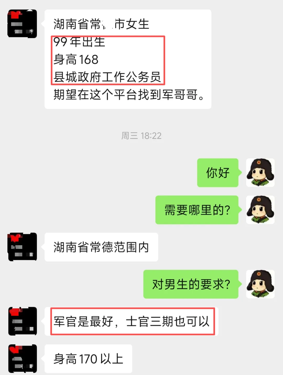 如今,一位99年出生、身高168cm的县城女公务员,明确希望在常德范围内找到一位军人,军官优先,三期及以上士官也可,并要求对方身高170cm以上。