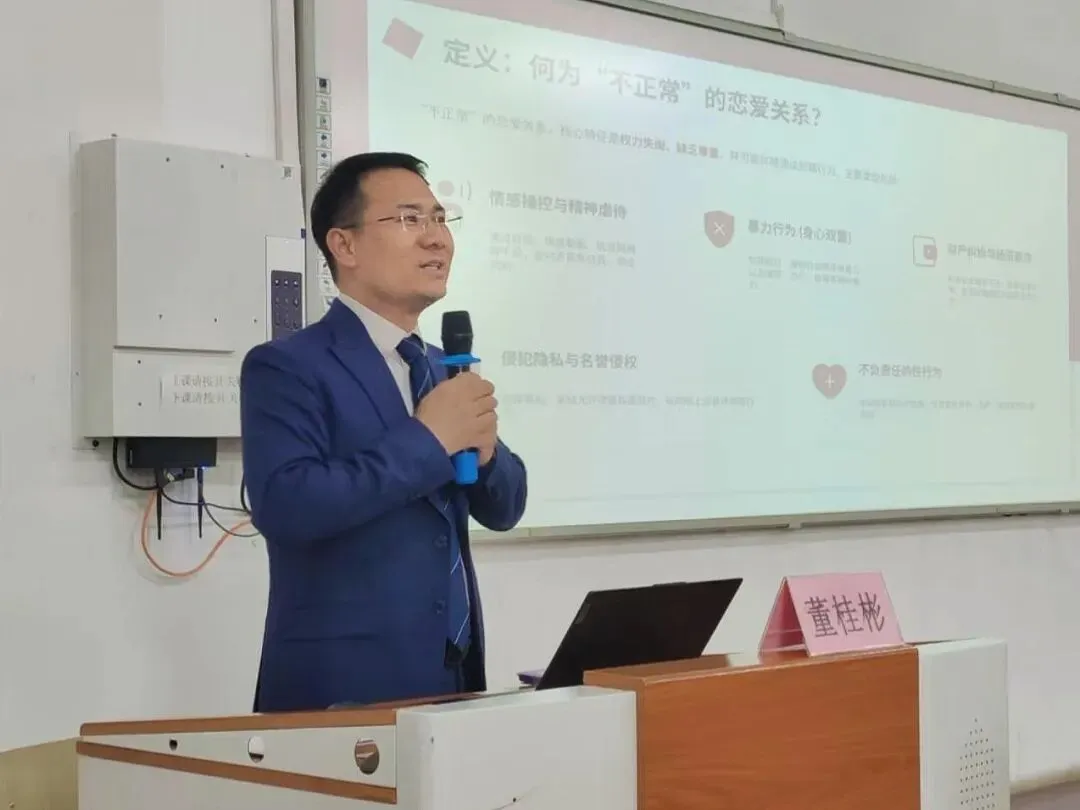 讲座中,董桂彬律师结合最新大学生婚恋调查数据,剖析当前校园恋爱普遍存在的颜值至上、消费过高、自我保护意识薄弱等问题,清晰界定“不正常恋爱关系”,揭露情感操控、精神暴力、经济纠纷、隐私侵权等危害,让学子直观认清风险、守住底线。