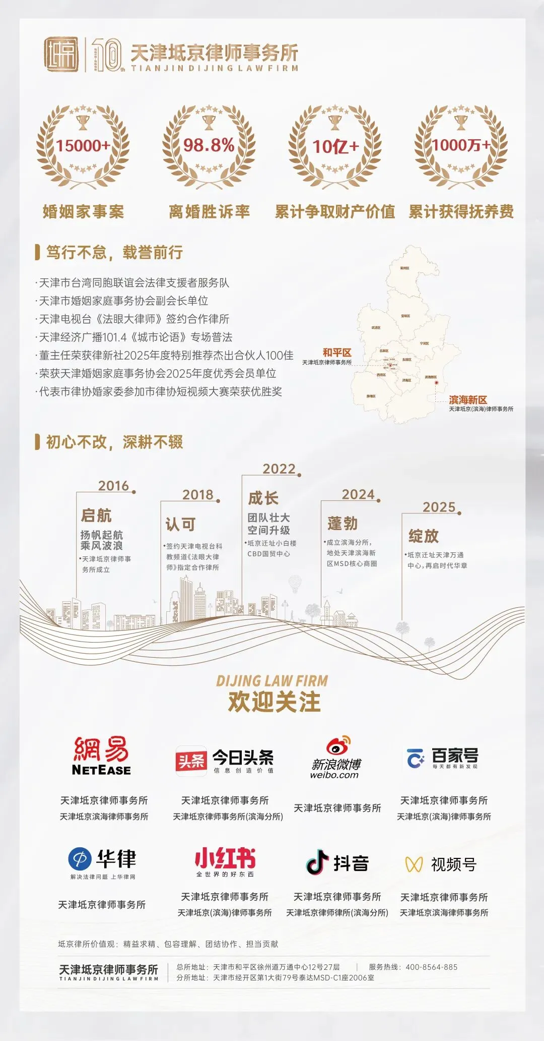 2026年是天津坻京律师事务所成立十周年,作为深耕婚姻家事领域的专业律所,我们始终坚守法治初心、践行社会责任,紧扣“十五五”规划发展方向与市民政局20项民心工程部署,以专业力量服务社会、守护青年成长。