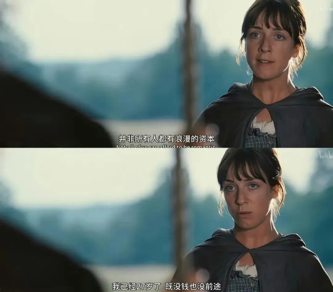 夏洛特说,她已经27岁了,既没钱也没前途,已经是父母的负担了。并非所有人都有浪漫的资本,她只想安稳地度过一生。对她来说,柯林斯是一个不错的选择。