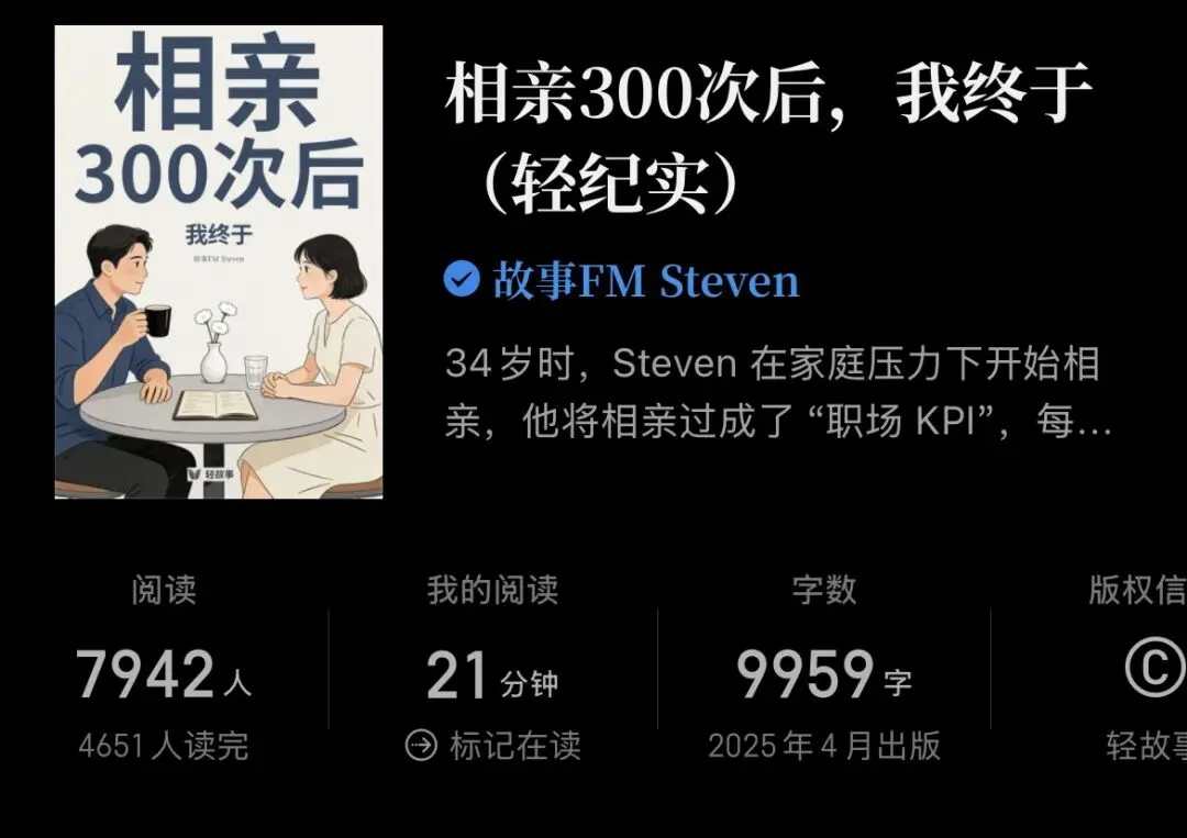 微信读书,看到“相亲300次后,我终于”的纪实书名,我忽然想起自己这些年的经历——从朋友、家人安排的邻里相亲,到线上平台的匹配见面,没有惊天动地的缘分,却让我对当下的婚恋现状有了最真切的感悟。