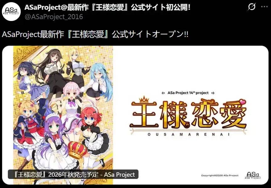 颜艺社(AsaProject)宣布其最新作《王様恋愛》将于2026年秋季发售,目前游戏官网已公开。