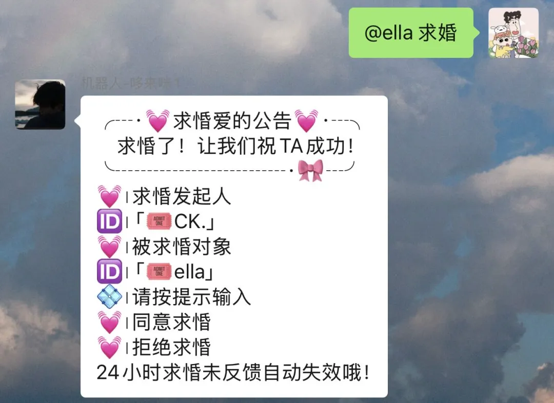 功能很简单:两个人互相求婚,对方同意,就成了。