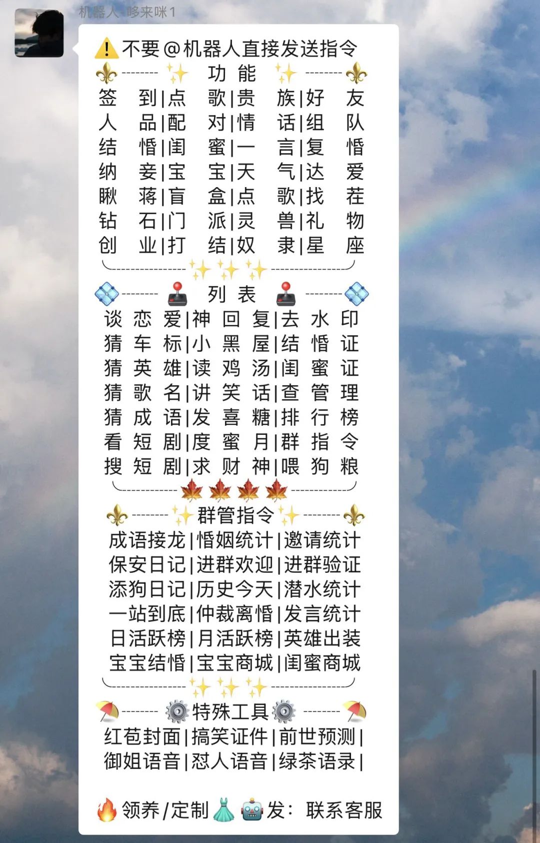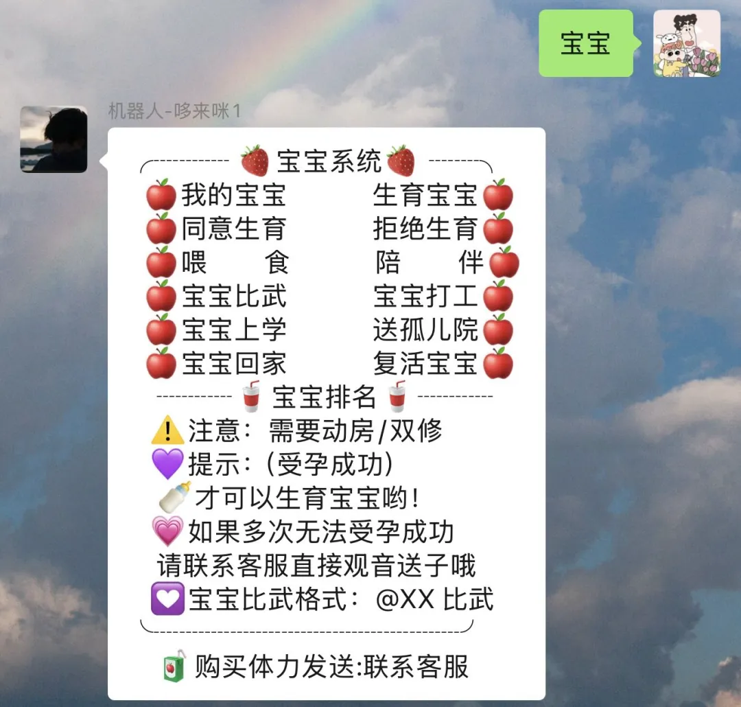 后来他在群里加了哆来咪,开了结婚和宝宝功能。