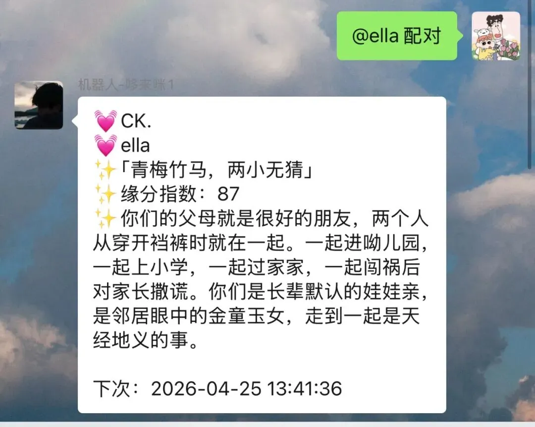 配对测试:输入命令,随机匹配群里的异性,配上之后还有契合度评分。群里直接炸锅,"我跟谁配的?凭什么才70分?"