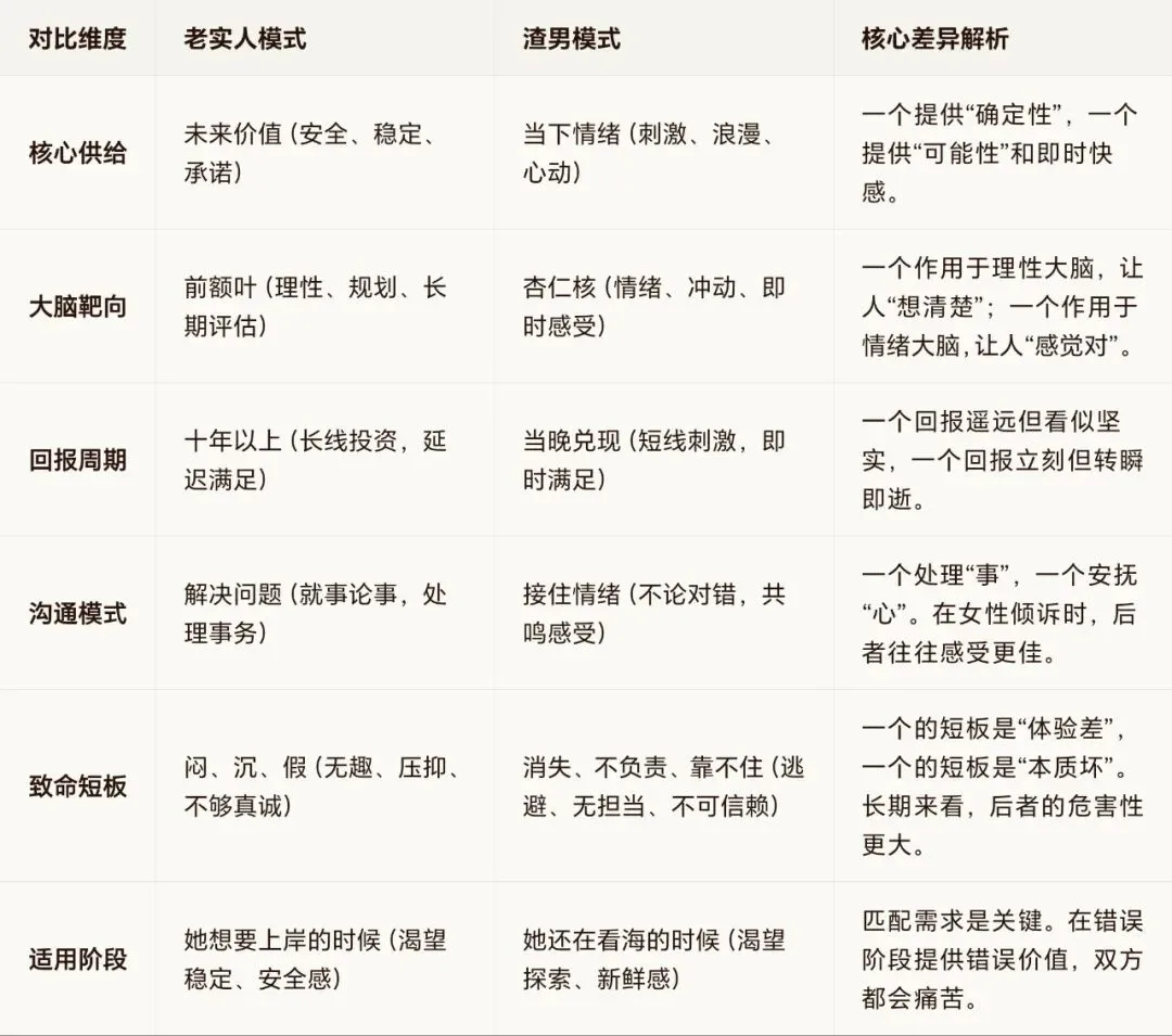 那个凌晨三点带她去吃烧烤的人,一上来就敲了她的杏仁核。你在那边措辞得体地规划“以后孩子在哪上学”,她的情绪脑早就把那个人和“痛快”焊在一起了。