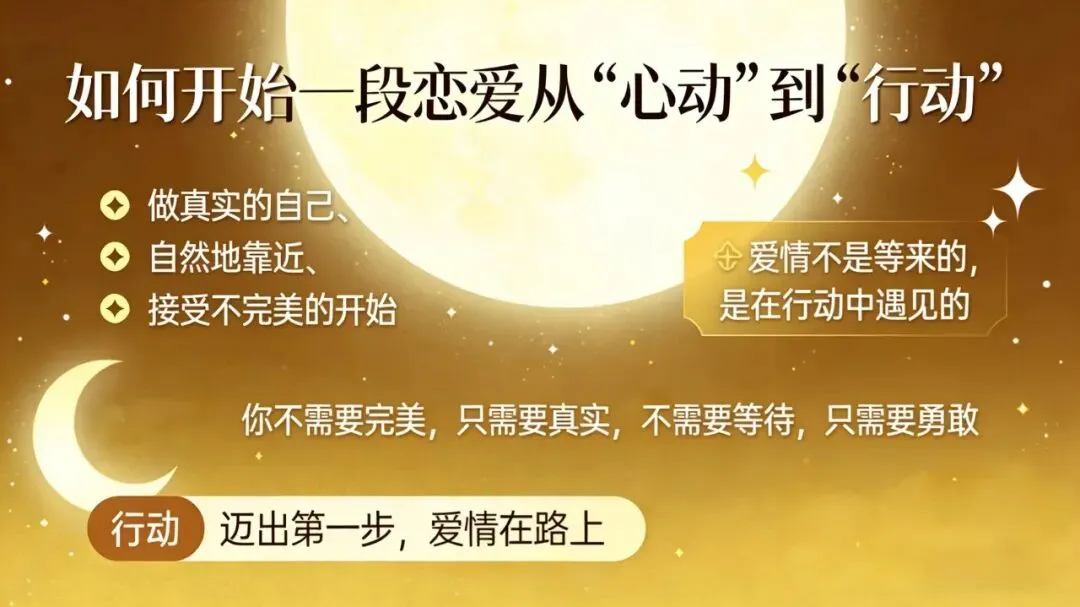 月亮湾建议:把“开始”当成一场“实验”。你们一起吃饭、聊天、散步,看看彼此是否合拍。如果不合适,就体面地结束;如果合适,就继续走下去。