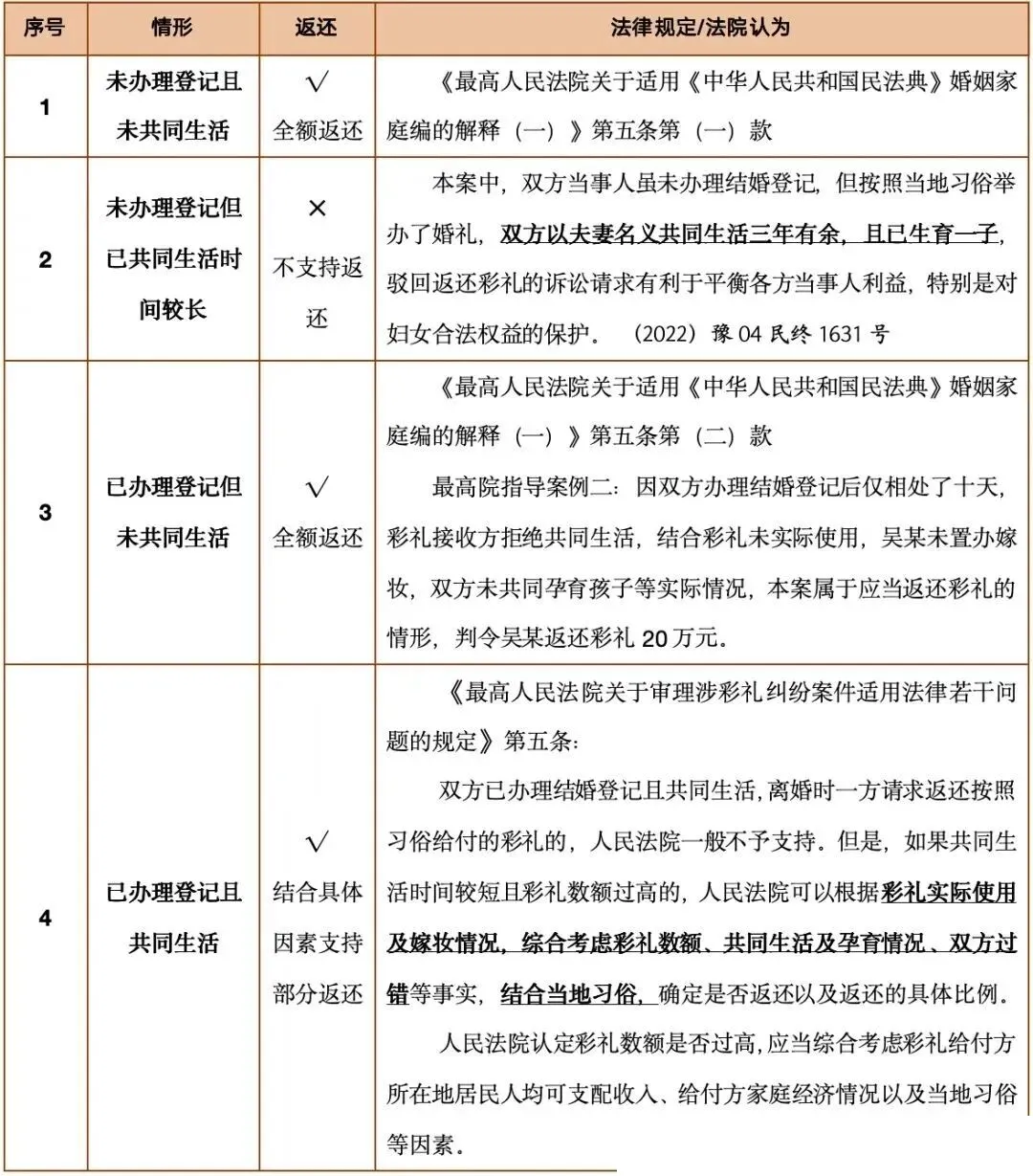 1. 双方没办结婚登记,不管有没有共同生活,原则上都能要求返还(共同生活过的,会扣除一部分共同花销);2. 办了结婚登记,但确实没共同生活过,离婚的时候可以要求返还;3. 婚前给了彩礼,导致男方家里生活困难,离婚的时候也能要求返还。这里提醒一句,主张返还彩礼,一定要保留好证据,比如转账备注写“彩礼”、聊天记录里提到“结婚用”、当地的彩礼习俗证明等,没有证据,很难得到法院支持。若一方明确向另一方借钱(如“应急借10万,後续归还”),属于民间借贷,与恋爱关系无关。