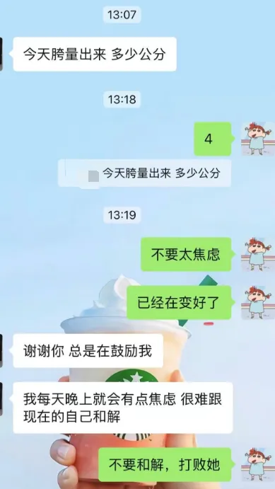 她和何梅君护士的缘分,从一胎就结下了,俩人事先在微信里聊成了无话不谈的姐妹。夜里睡不着,她会对着手机拍个锻炼视频发给何护士:“姐姐,你看看我这动作对不对呀?”何护士总能秒回,还带个甜甜的笑脸:“动作超标准!不过现在都深夜啦,快乖乖睡觉,养足精神才好恢复~”偶尔emo了,她会跟何护士吐槽:“感觉离以前的自己好远,怎么都和解不了……”何护士总会温柔地安抚:“焦虑不可怕呀,咱们一起打败它,你已经很棒啦!”