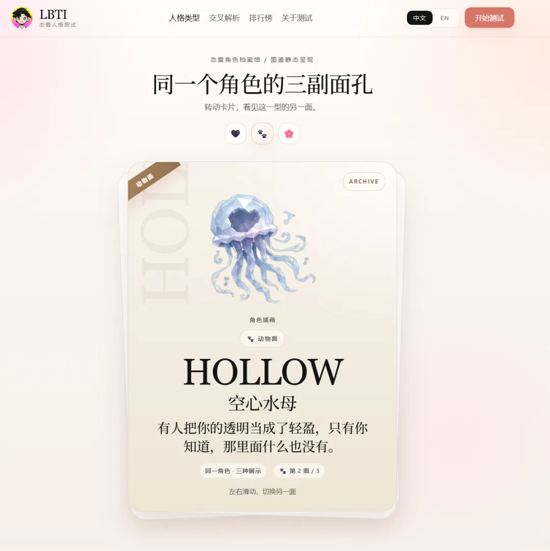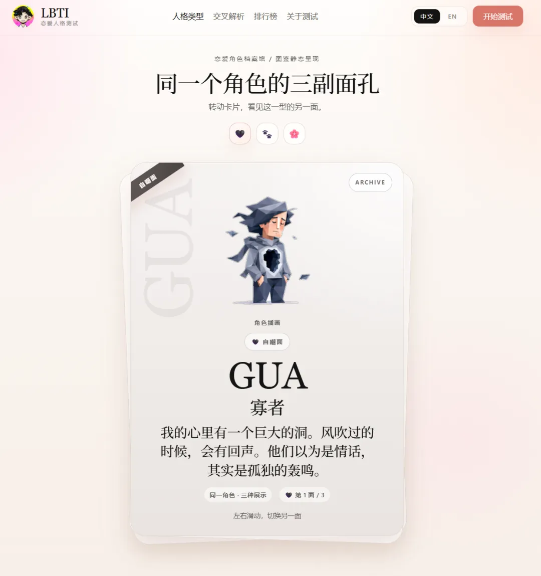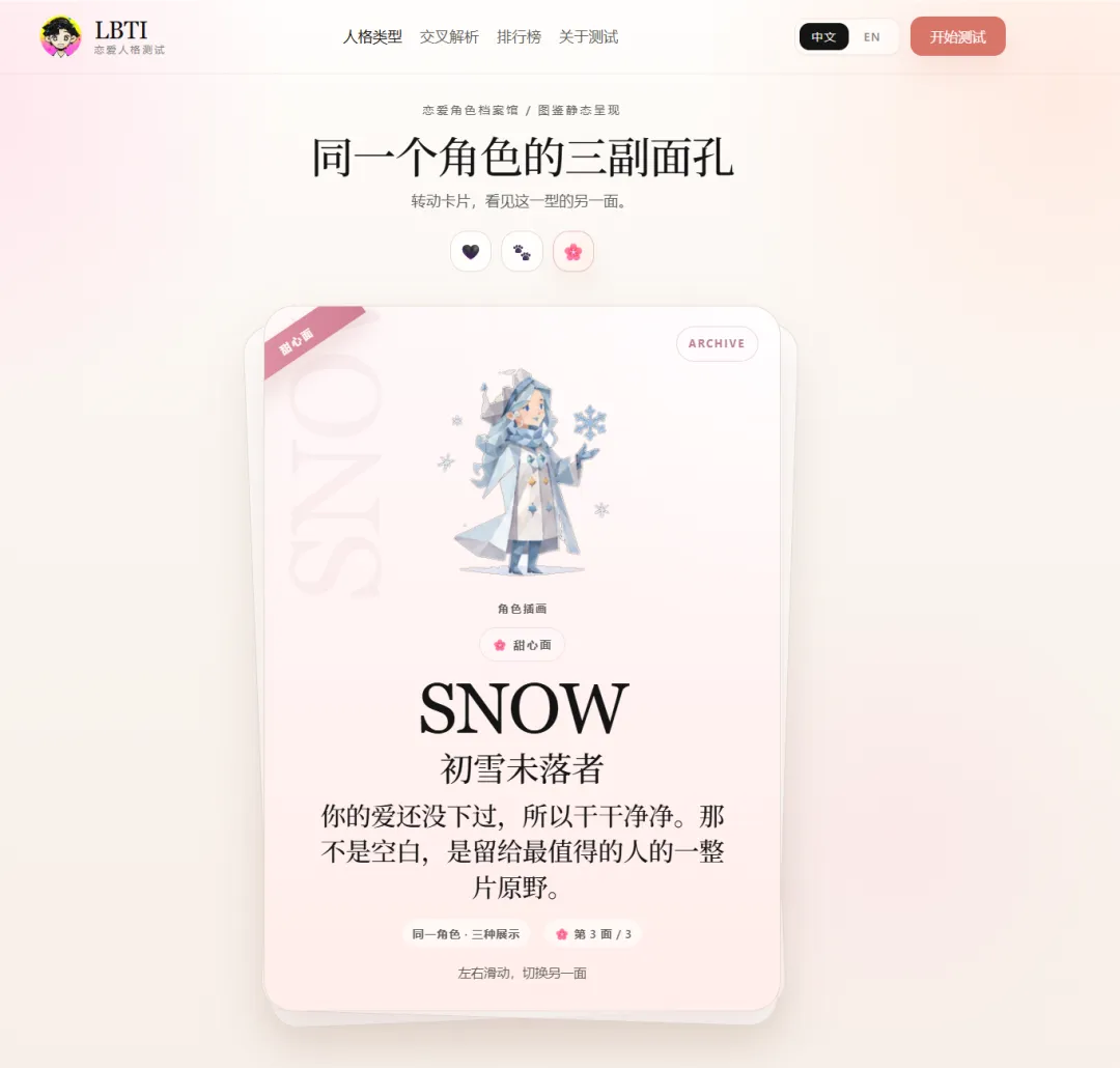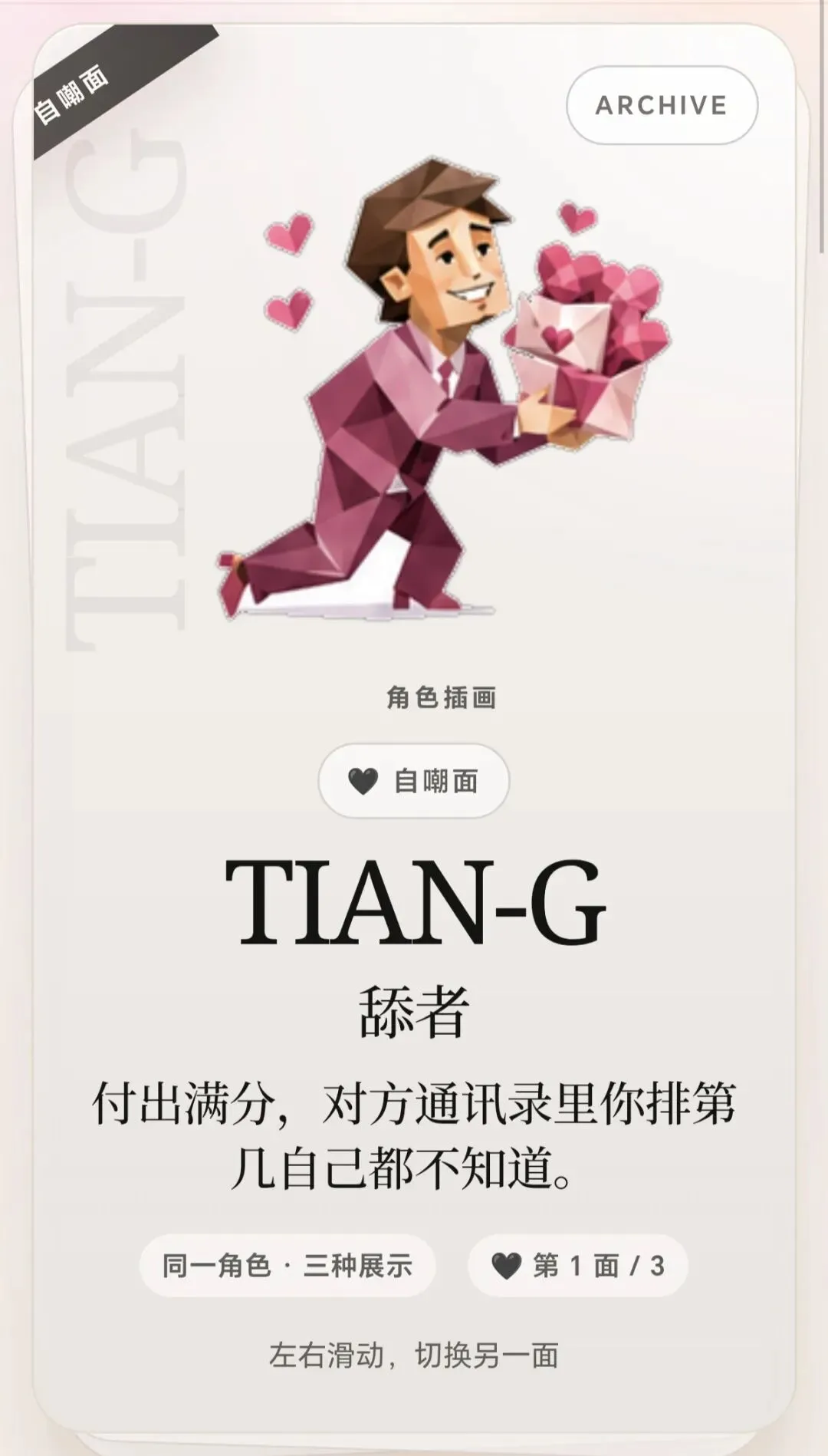 我去看角色档案,发现居然有三个角色面?!很新奇啊,动物面,自嘲面,甜心面。感觉对应角色的三个角度,甜心面纯爱,自嘲面绷不住了骂醒了,动物面感觉一下子就清醒客观了。