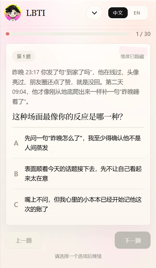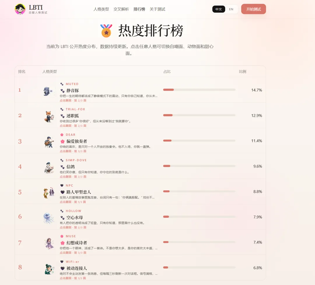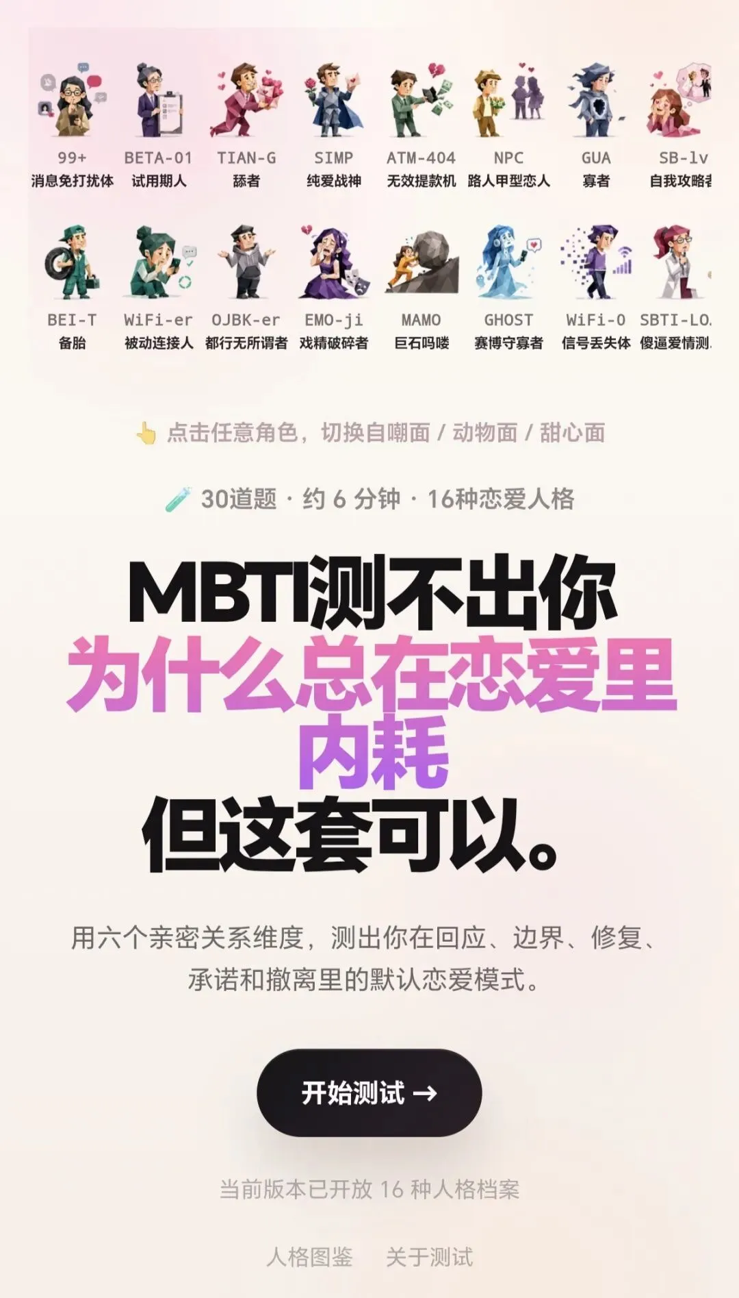 后面我认真答题,终于不是舔狗了,结果?变成gua者,真是母胎solo有原因的,甜心面算安慰我了,不忍心看自嘲面