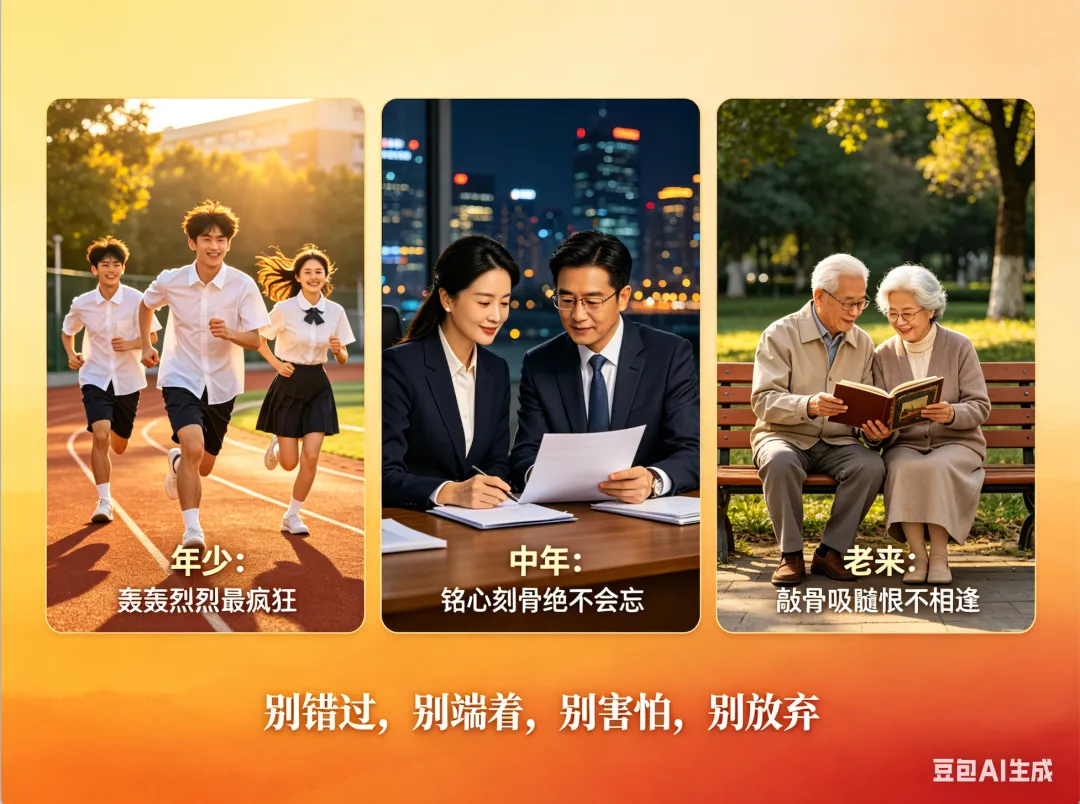 年少的时候轰轰烈烈最疯狂。中年的时候铭心刻骨,绝不会忘。老来的时候才叫敲骨吸髓,恨不相逢。