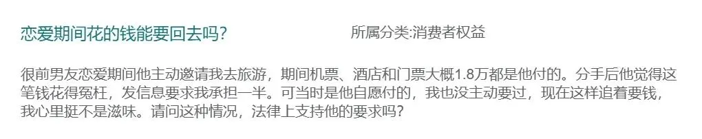 前男友恋爱期间主动邀请我去旅游,在此期间,机票、酒店和门票大概1.8万都是他付的。分手后他觉得这笔钱花得冤枉,发信息要求我承担一半。可当时是他自愿付的,我也没主动要过,现在这样追着要钱,我心里挺不是滋味。请问这种情况,法律上支持他的要求吗?