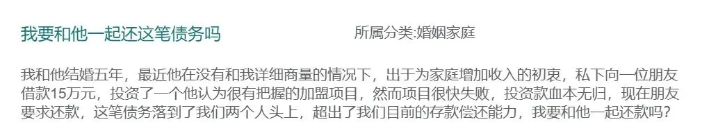 我和他结婚五年,最近他在没有和我详细商量的情况下,出于为家庭增加收入的初衷,私下向一位朋友借款15万元,投资了一个他认为很有把握的加盟项目,然而项目很快失败,投资款血本无归,现在朋友要求还款,这笔债务落到了我们两个人头上,超出了我们目前的存款偿还能力,我要和他一起还款吗?