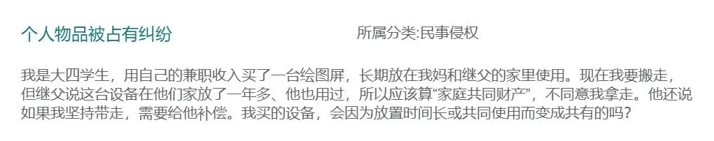 我是大四学生,用自己的兼职收入买了一台绘图屏,长期放在我妈和继父的家里使用。现在我要搬走,但继父说这台设备在他们家放了一年多、他也用过,所以应该算“家庭共同财产”,不同意我拿走。他还说如果我坚持带走,需要给他补偿。我买的设备,会因为放置时间长或共同使用而变成共有的吗?
