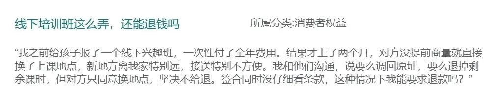 我之前给孩子报了一个线下兴趣班,一次性付了全年费用。结果才上了两个月,对方没提前商量就直接换了上课地点,新地方离我家特别远,接送特别不方便。我和他们沟通,说要么调回原址,要么退掉剩余课时,但对方只同意换地点,坚决不给退。签合同时没仔细看条款,这种情况下我能要求退款吗?