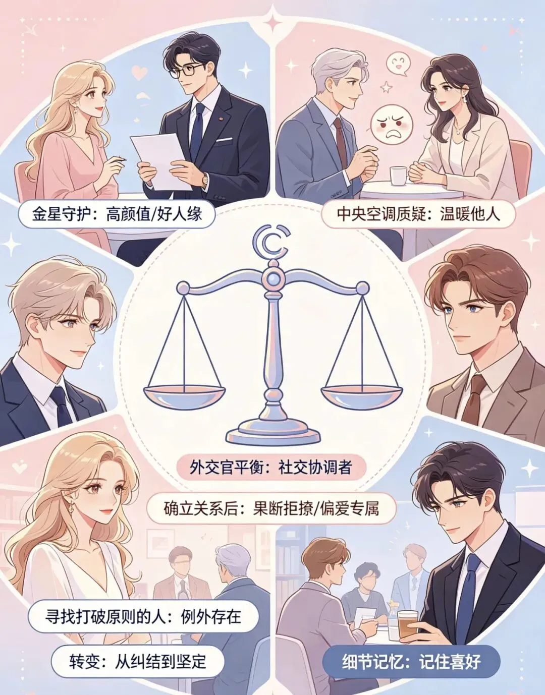 金星守护的天秤颜值高,人缘好,常被质疑是中央空调。天秤对所有人都保持礼貌,优柔寡断的性格导致暧昧关系丛生。他们像外交官一样平衡各方关系,实则在寻找能打破自己原则的人。一旦确立关系,天秤会果断拒绝其他追求者,将温柔与偏爱全部留给伴侣。平时纠结选餐厅的他们,会记住伴侣的所有喜好,默默规划未来,用细节证明。金星能量使天秤追求和谐关系,但真正的和谐需要偏爱而非平衡。当伴侣成为例外时,天秤的忠诚度会转化为排他性守护。