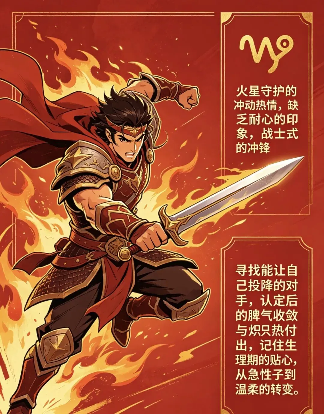 火星守护的白羊冲动易怒,被认为缺乏耐心。白羊热情似火,容易对新鲜感上头,但大多停留在浅层吸引。他们像战士冲锋陷阵,实则在寻找能让自己投降的对手。一旦认定伴侣,白羊会收起暴躁脾气,用炽热的爱融化对方,他们会为伴侣改变急性子。平时大大咧咧的他们,会记住伴侣的生理期,默默准备暖宝宝,用行动证明。火星能量使白羊追求征服感,但真正的征服是需要被征服。