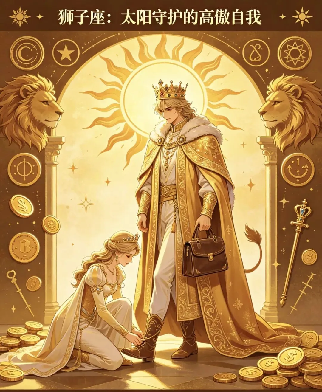 太阳守护的狮子高傲自我,被认为不懂妥协。狮子享受被崇拜的感觉,容易与多人暧昧,但大多是虚荣心作祟。他们像国王巡视领土,实则在寻找能让自己屈膝的王后。