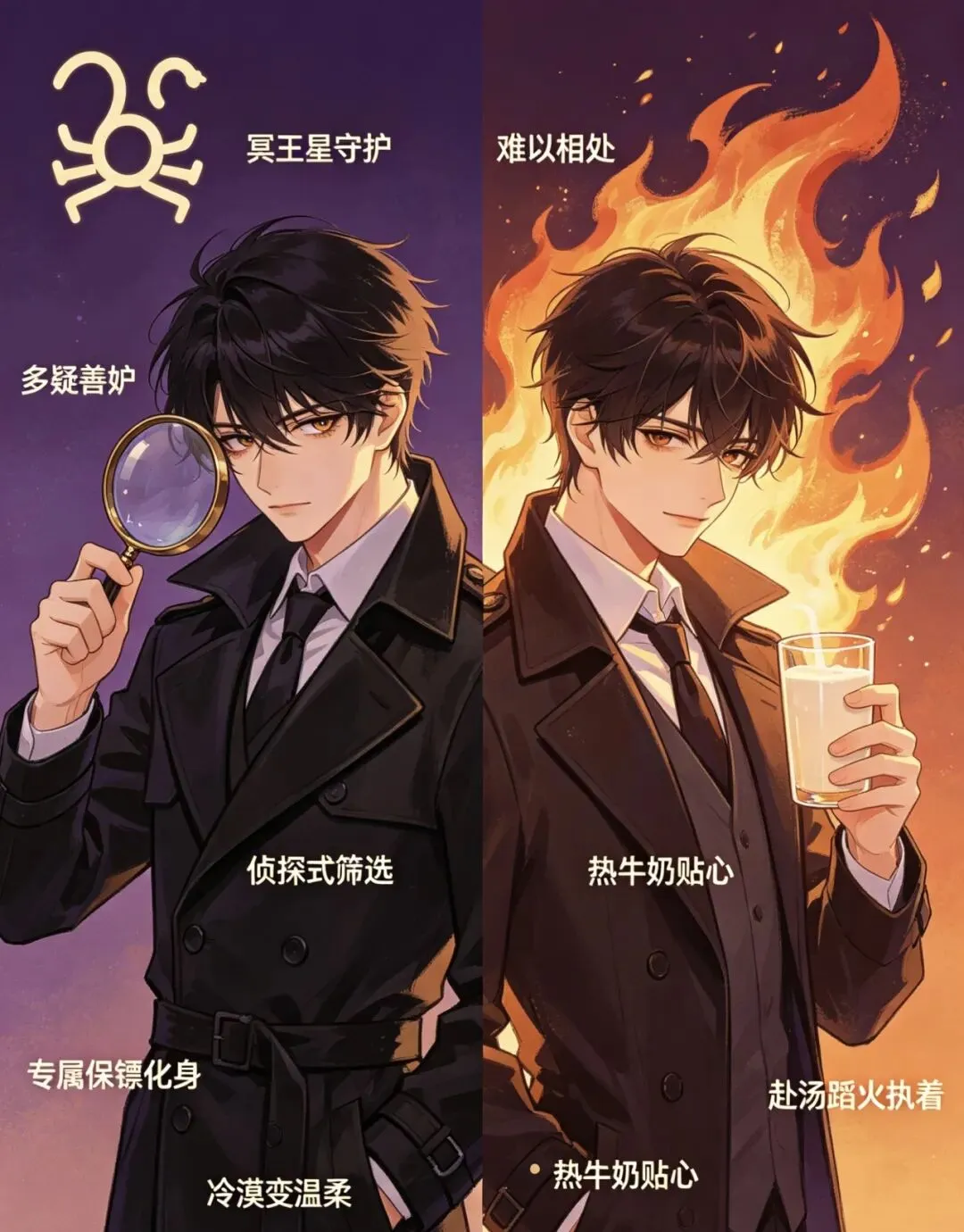 冥王星守护的天蝎多疑善妒,被认为难以相处。天蝎擅长用神秘感吸引他人,但情感投入极为谨慎,他们像侦探筛选线索。认定伴侣后,天蝎会化身专属保镖,用生命守护对方,他们会为伴侣改变冷漠性格。平时冷若冰霜的他们,会为伴侣热牛奶。冥王星能量使天蝎追求忠诚,当伴侣通过测试后,天蝎的爱会转化为赴汤蹈火的执着。