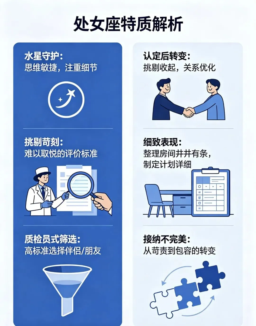 水星守护的处女挑剔苛刻,被认为难以取悦。处女对伴侣要求极高,容易因细节不满分手。他们像质检员一样筛选产品,实则在寻找能让自己喜欢的人。认定伴侣后,处女会收起挑剔,用全部精力优化关系。平时吹毛求疵的他们,会为伴侣整理房间,制定计划。水星能量使处女追求完美,但真正的完美需要接纳不完美。