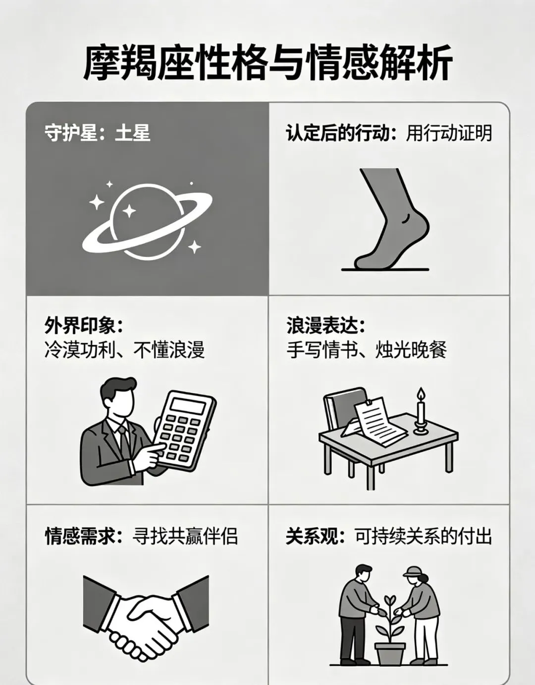 土星守护的摩羯冷漠功利,被认为不懂浪漫。摩羯注重现实利益,容易被误认为利益至上,他们像商人一样看似在评估项目,实则在寻找能与自己共赢的人。在认定伴侣后,摩羯会用实际行动证明忠诚。