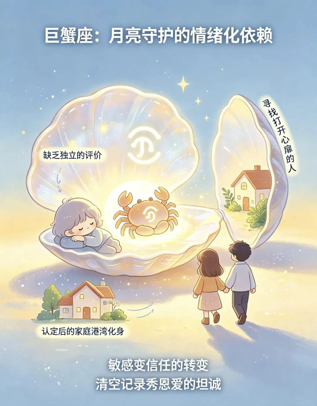 月亮守护的巨蟹情绪化依赖,被认为缺乏独立性。巨蟹容易对温柔体贴的人产生依赖,但大多是情感投射。他们像贝壳闭合保护自己,实则在寻找能让自己打开心扉的人。