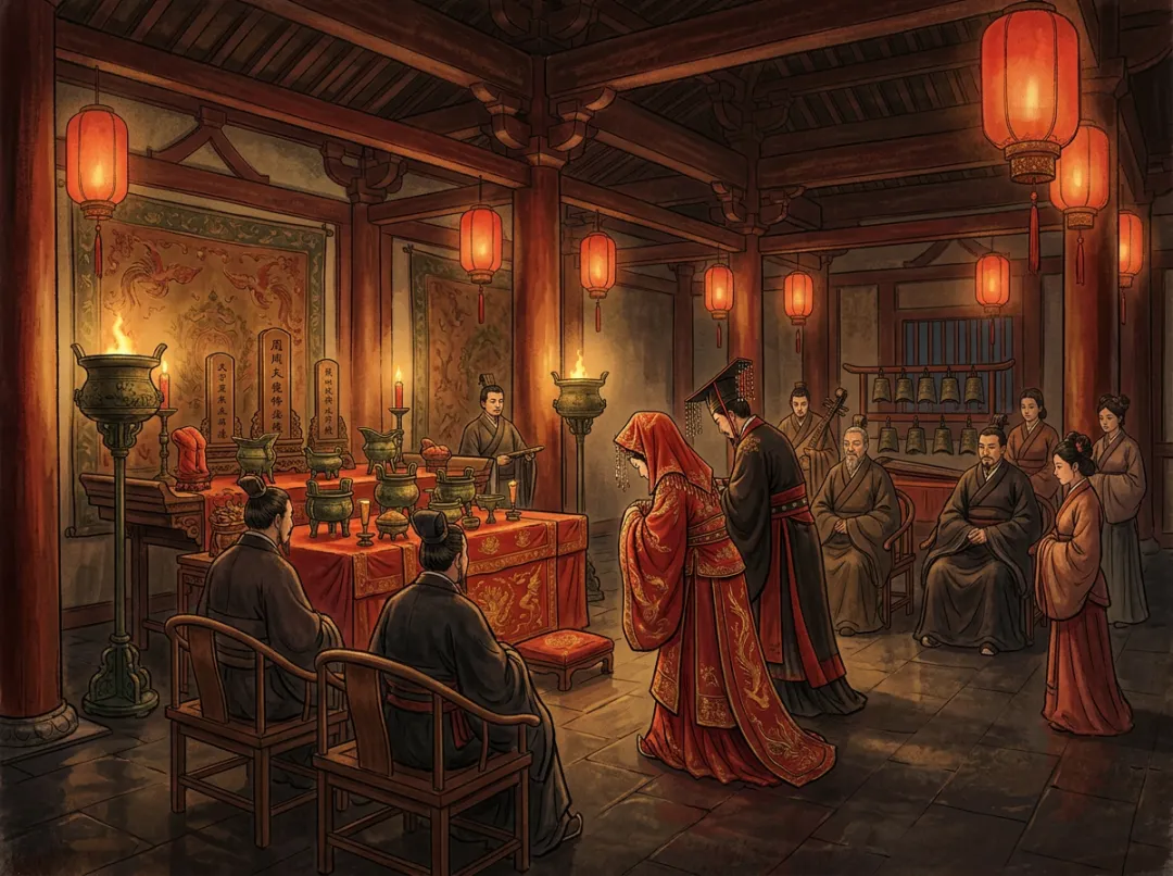 在周代,婚姻的起点不是爱情,甚至不是两个人的意愿,而是一套被称为"六礼"的完整流程:纳采、问名、纳吉、纳征、请期、亲迎。这套流程听起来复杂,本质上和今天的"见家长—谈条件—订婚—备婚—择吉日—办婚礼"并没有太大区别。唯一的区别在于:周代的"六礼"不是可选的仪式,而是国家法典规定的硬性要求。