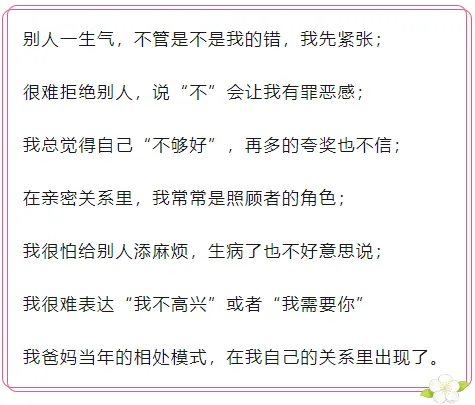给大家提供一个自检清单,如果你中了3条以上,原生家庭的影响就比较明显了,仅供参考哈: