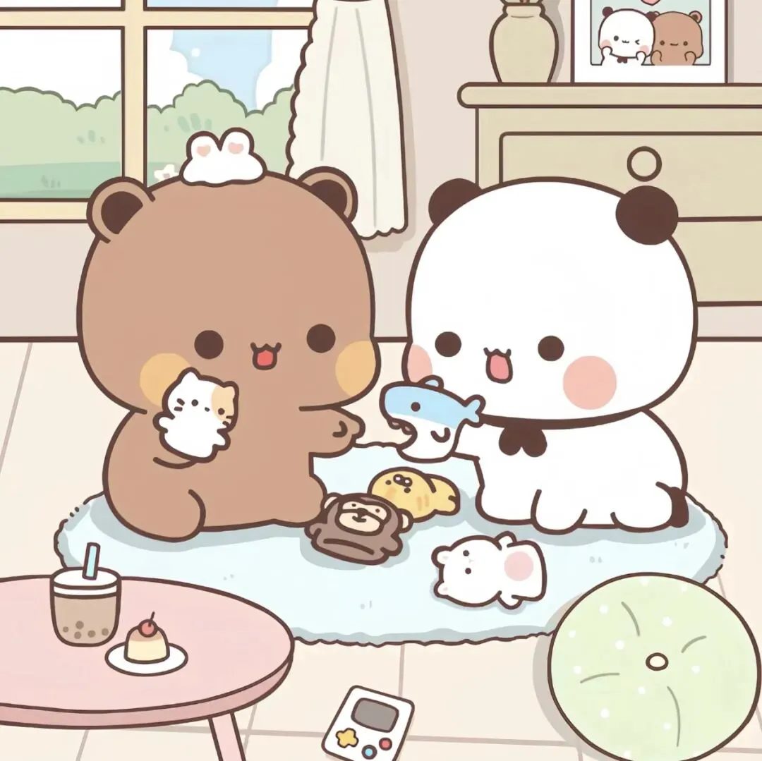 故事的开始,是两个软乎乎的小家伙窝在暖乎乎的小地毯上,把玩偶一个个摆出来分享。布布怀里抱着小猫咪玩偶,头顶还别着一二送的小发夹,眼睛亮晶晶地看向一二;一二举着小鱼玩偶,晃着圆滚滚的身子递过去,好像在说“给你我的专属小宝藏”。茶几上的奶茶冒着甜丝丝的气,旁边的小蛋糕还带着樱桃,窗外的阳光刚好落在它们身上,连空气里都飘着“和你一起玩,就是最开心的事”的温柔。