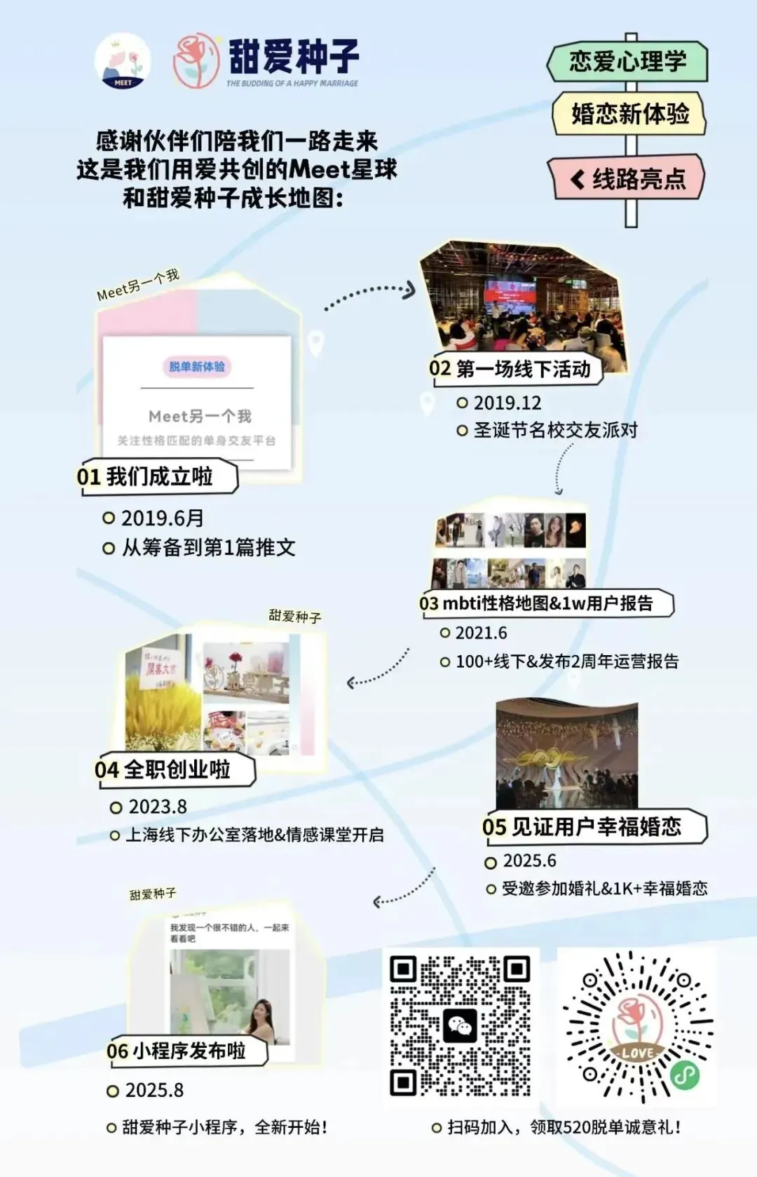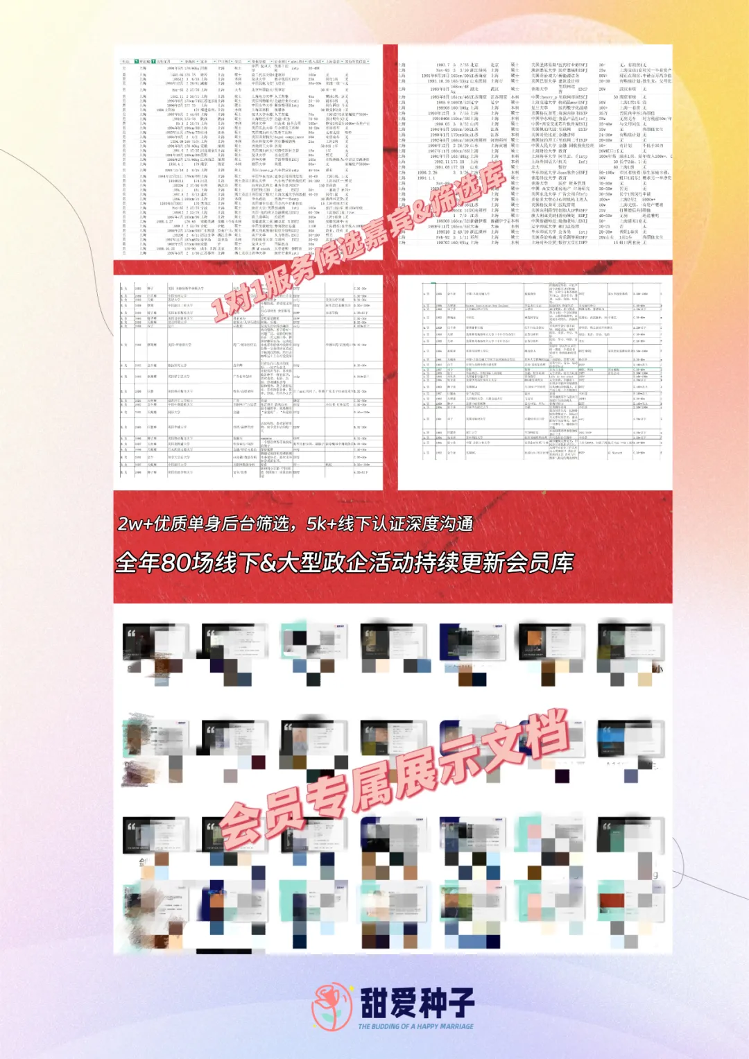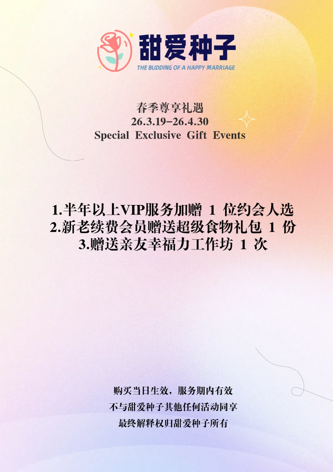 我们不断升级甜爱VIP服务流程和服务体验,1对1精准匹配VIP和情感顾问服务板块好评满满!为回馈大家多年来的信任与支持,我们为新签约或续约VIP提供价值3999元的春季尊享礼遇!你好,我是子佟。从英国金融系毕业后,我曾经历过职业焦虑和关系废墟,为了“自救”,我走向了心理学与亲密关系疗愈的旅程。2019年创办以来,我们从海归和名校名企圈开始,我们发布200+单身帖&运营300场+高质量单身交友活动,在公众号/私域/小程序/小红书/抖音/视频号等累计3w+用户。23年夏天,我决定辞去金融工作,全职投入婚恋社交和情感行业,并在这个过程我逐渐确信这是我热爱的事业。 甜爱种子官网:https://meetdejevu.com/我们也是上海婚姻介绍行业协会的会员单位,也是政企单位信赖的资源合作伙伴。和上海、杭州等30+政企单位达成企业资源合作。2025年8月,创始人佟佟姐作为婚恋专家受邀为上海九江商会、九江驻沪办主办的120人相亲交友活动做恋爱心理学分享;25年10月,作为婚协单位为浦东妇联、浦东团委举办的大型单身、宠物经济市集活动举办单身联谊活动。我们不只是“拉郎配”,我们是“精准匹配+情感成长+高质量活动”三轴驱动。从2019年开始,已有300+场高质量恋爱心理学元素名校海归交友活动,50+场情感工作坊和亲密关系疗愈专场,在上海的海归名校社交领域属于口碑和知名度top天花板级别。