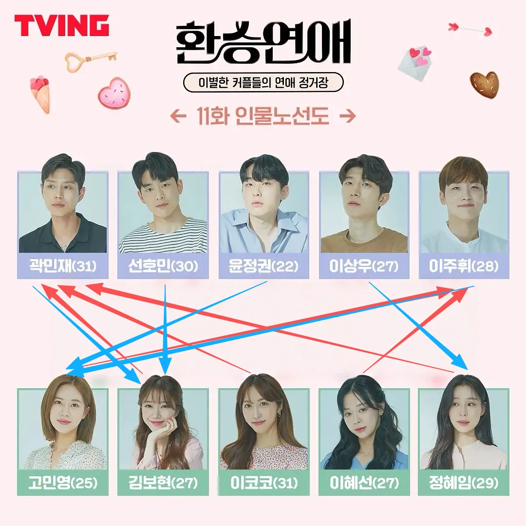 在首尔浩民明确地与宝玹划清界限,甚至说出“你真的很好这件事跟我觉得我们已经不合适是两码事”这种冷漠的话,普贤时常心痛流泪,但是到了济州岛后,浩民开始想起过去,直到最终选择,不放弃地希望可以挽回普贤。但在他俩拉扯纠结的过程中有一位珉在从始至终是普贤的向日葵,一如既往的选择普贤,最终不仅打动了观众也打动了普贤。最终43互选。另一位大女主可可,她聪明漂亮,有体面的工作,有优渥的家境,但是却常常获得0票...她跟珉在十年前美好的校园情侣,到现在互相支持,大概就是分手后最好的状态了吧。珉在那句安慰“在许多韩国人中这只是其中5位而已”,他们并不能代表什么,给了可可很有力的应援。最后可可做完终选那自由在路上开车的样子,让人替她开心。敏英前期跟正权互相暧昧拉扯,但是周辉又争又抢,坚定的选择敏英直到最后,敏英最后面对自己的内心选择周辉。惠善初期以为正权对自己旧情未完,实际正权慢慢被敏英吸引,独留惠善无法释怀,好在后期惠善转向周辉,奈何周辉就是为了敏英而来的...