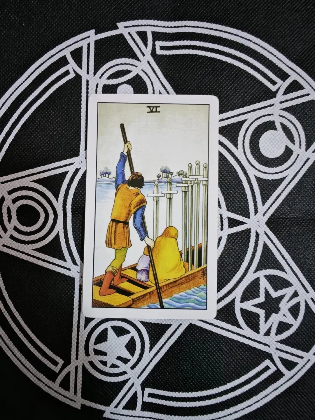 第一张抽到的是宝剑六,这组牌的宝子你们在感情里现在可能正处在“拖着走、没解决的困境里”。你们目前的关系存在矛盾,且双方可能都在刻意回避矛盾,谁也不愿主动挑明问题,只是在维持表面的平静,像在河上漂流,没动力解决根源问题。彼此之间的沟通也像隔了一层,有委屈、不满都藏着不说,慢慢形成了无形的隔阂,让关系变得沉闷又疲惫。建议你们不要冷战或逃避,而是找个机会把话说开,一起跨过这道坎。