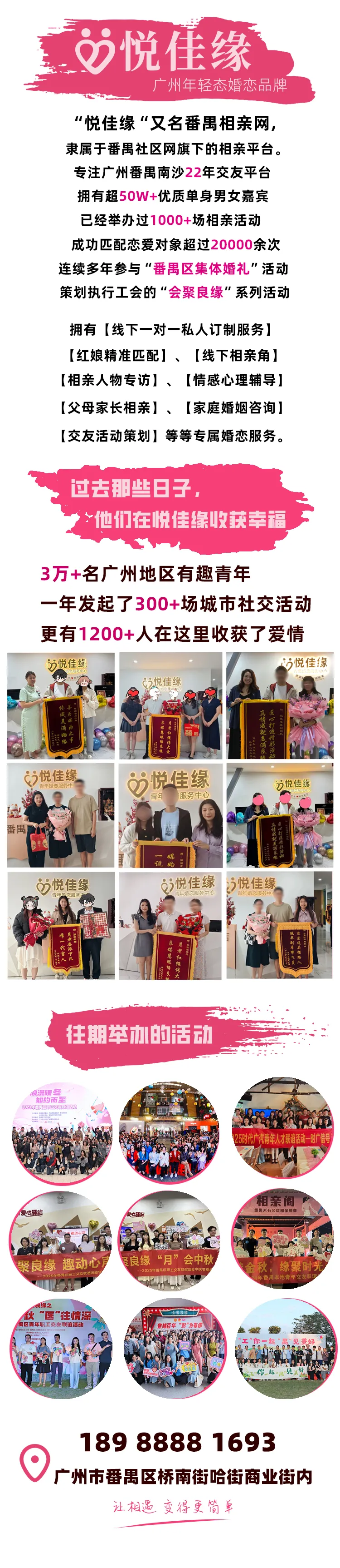 悦佳缘——番禺本土严肃婚恋平台,专为认真找伴侣、奔着婚恋去的单身朋友,打造专属五一线下婚恋活动,不用再被催婚焦虑,不用在杂乱人群中浪费时间,趁假期,遇见同频良缘❤️严肃婚恋·精准匹配·高效脱单,全程拒绝休闲交友、拒绝婚托、拒绝虚假信息,所有参与嘉宾均经过身份、学历、婚况三重实名核验,只为给认真找伴的你,打造纯粹、安心的交友环境。📅 五一活动时间(3场专场,可任选参与):1. 5月1日 14:00-17:00 「体制内/国企专场」—— 汇聚番禺南沙机关、国企、事业单位优质单身,精准匹配,话题同频不冷场;2. 5月3日 14:00-17:00 「社恐友好专场」—— 轻量化互动,小范围交流,红娘全程引导,告别尴尬,轻松破冰;3. 5月5日 14:00-17:00 「综合优质专场」—— 覆盖医护、科创、职场精英,兼顾不同年龄、职业,拓宽择偶范围。广州市番禺区桥南街南郊路131号301(悦佳缘线下门店),私密舒适洽谈环境,专属活动区域,氛围温馨不压抑,让相处更自在。🌟 活动亮点(严肃婚恋专属):▫️ 严格配比:每场活动男女比例1:1,拒绝单一性别扎堆,保障互动质量;▫️ 互动设计:摒弃休闲游戏,围绕婚恋需求设置破冰交流、一对一深度约谈、红娘精准牵线等环节,边了解边筛选,高效锁定合拍之人;▫️ 全程护航:资深红娘全程在场,从破冰引导到后续牵线,提供一对一婚恋建议,助力双向奔赴;▫️ 专属福利:参与活动即可获得免费婚恋咨询1次,牵手成功额外赠送专属牵线跟进服务。点击小程序自助登记个人信息,完成实名核验后,即可预约对应场次活动,报满即止!全程无隐形消费,所有信息严格保密,仅用于本次活动核验与牵线。五一假期,与其独自宅家、应付催婚,不如来悦佳缘,和一群同样认真找伴的人,奔赴一场有温度、有质量的婚恋之约,趁假期,解锁专属幸福,早日告别单身💞