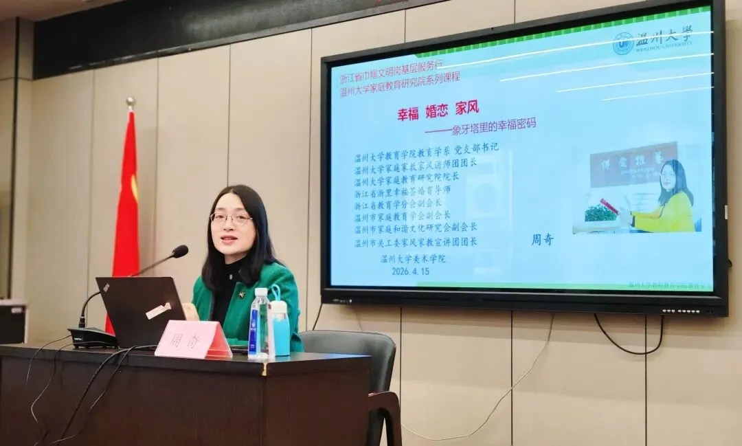 2026年4月15日下午,温州大学教育学院教育学系教工党支部书记、“浙里幸福荟”婚育导师周奇教授应邀走进温州大学美术与设计学院,为学子带来题为《幸福 婚恋 家风——象牙塔里的幸福密码》的幸福课。同学们齐聚一堂,共同探寻关于幸福与爱情的青春答案。