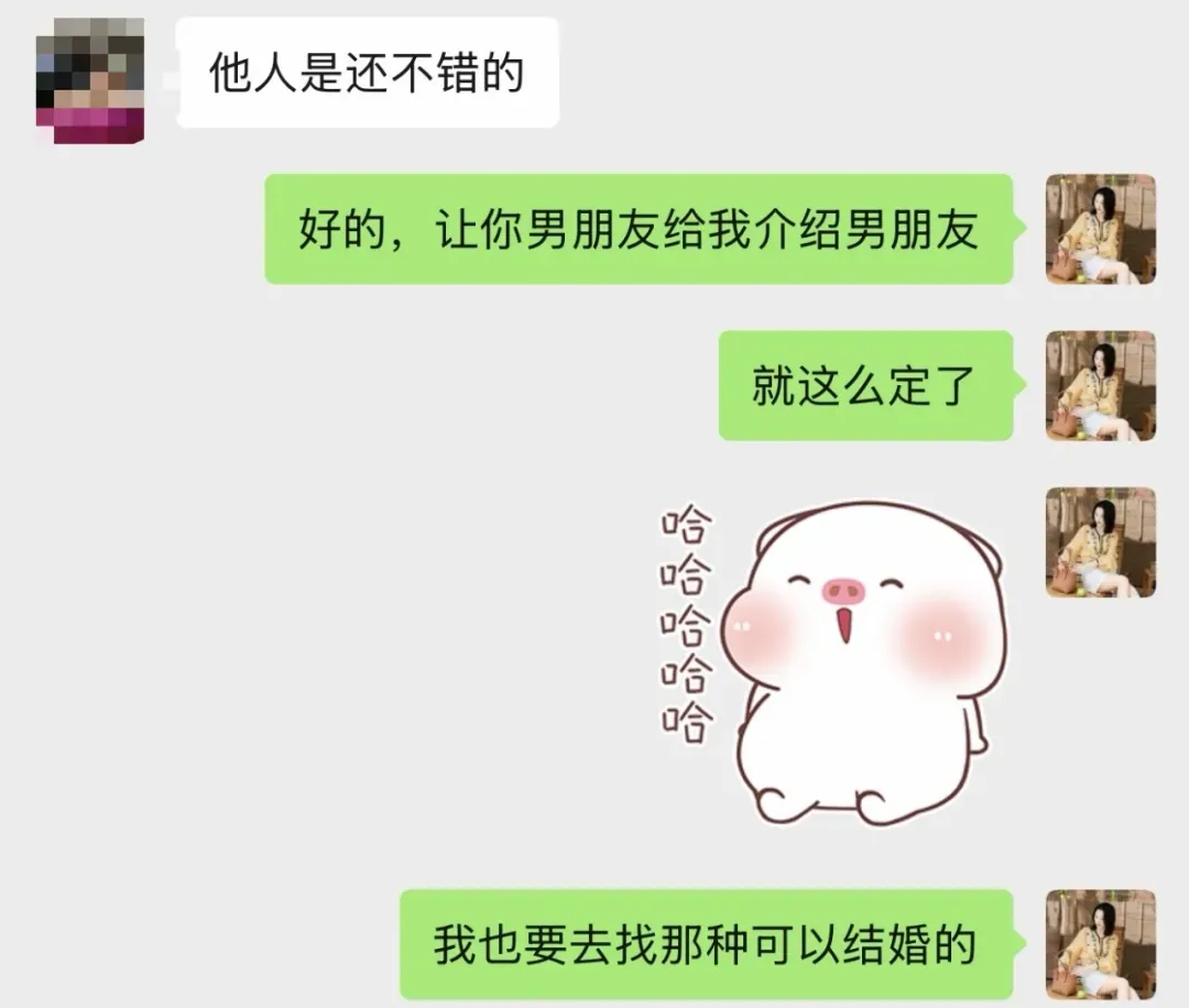 我随口开玩笑说,这么幸福,那让你男朋友给我也介绍一个呗。