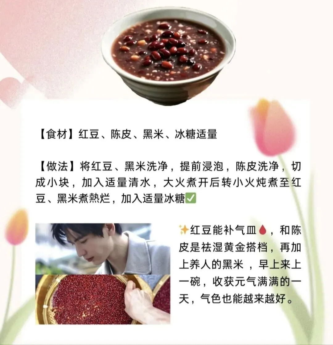 红豆是公认的补气血好物,搭配理气祛湿的陈皮,祛湿消肿效果翻倍;黑米滋阴养气色,暖养脾胃。
