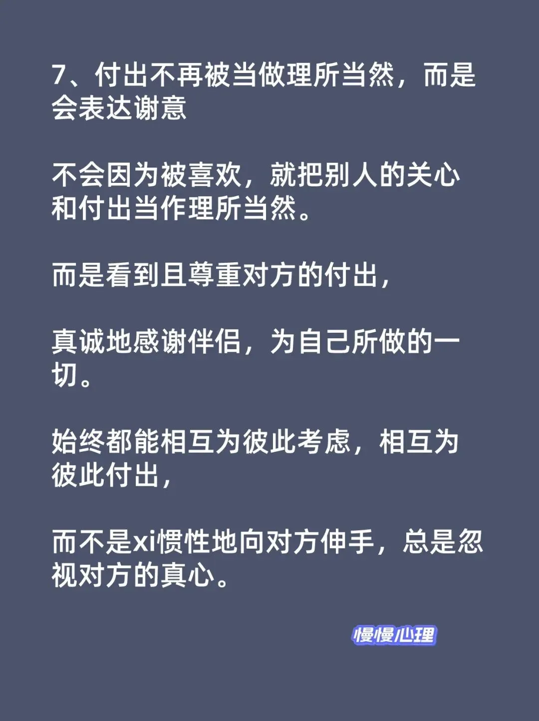 而是看到且尊重对方的付出,真诚地感谢伴侣,为自己所做的一切。始终都能相互为彼此考虑,相互为彼此付出,而不是习惯性地向对方伸手,总是忽视对方的真心。