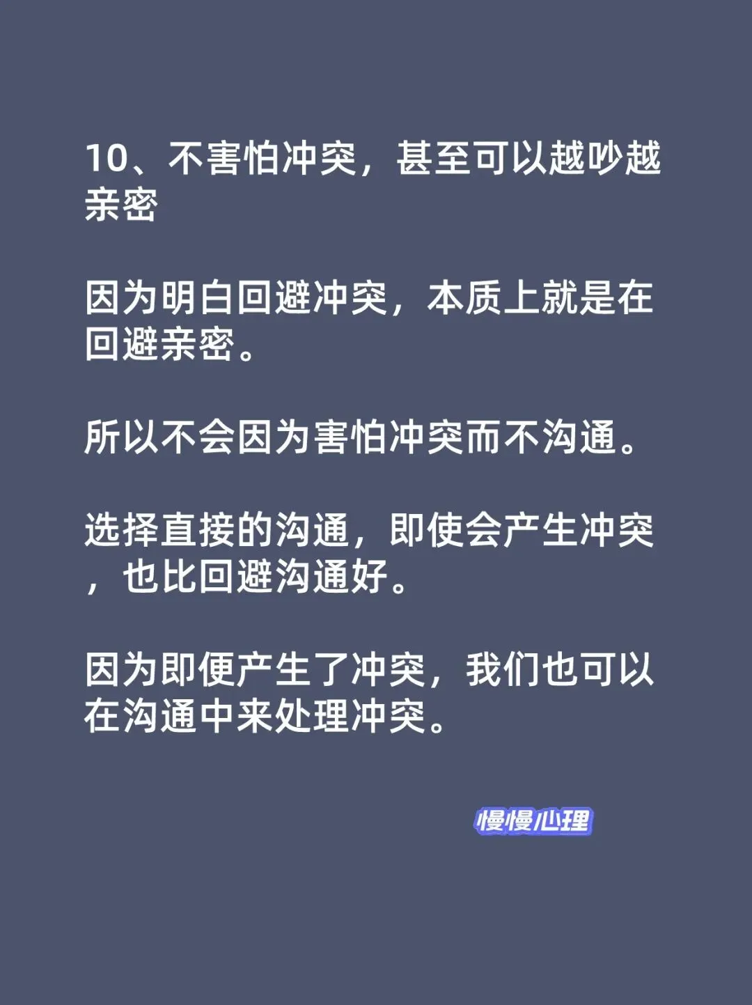 不会拉黑删除,沉默不语,不闻不问,玩消失,而是积极解决问题。就算问题暂时得不到解决,至少也能好好沟通问题出在哪儿。10、不害怕冲突,甚至可以越吵越亲密